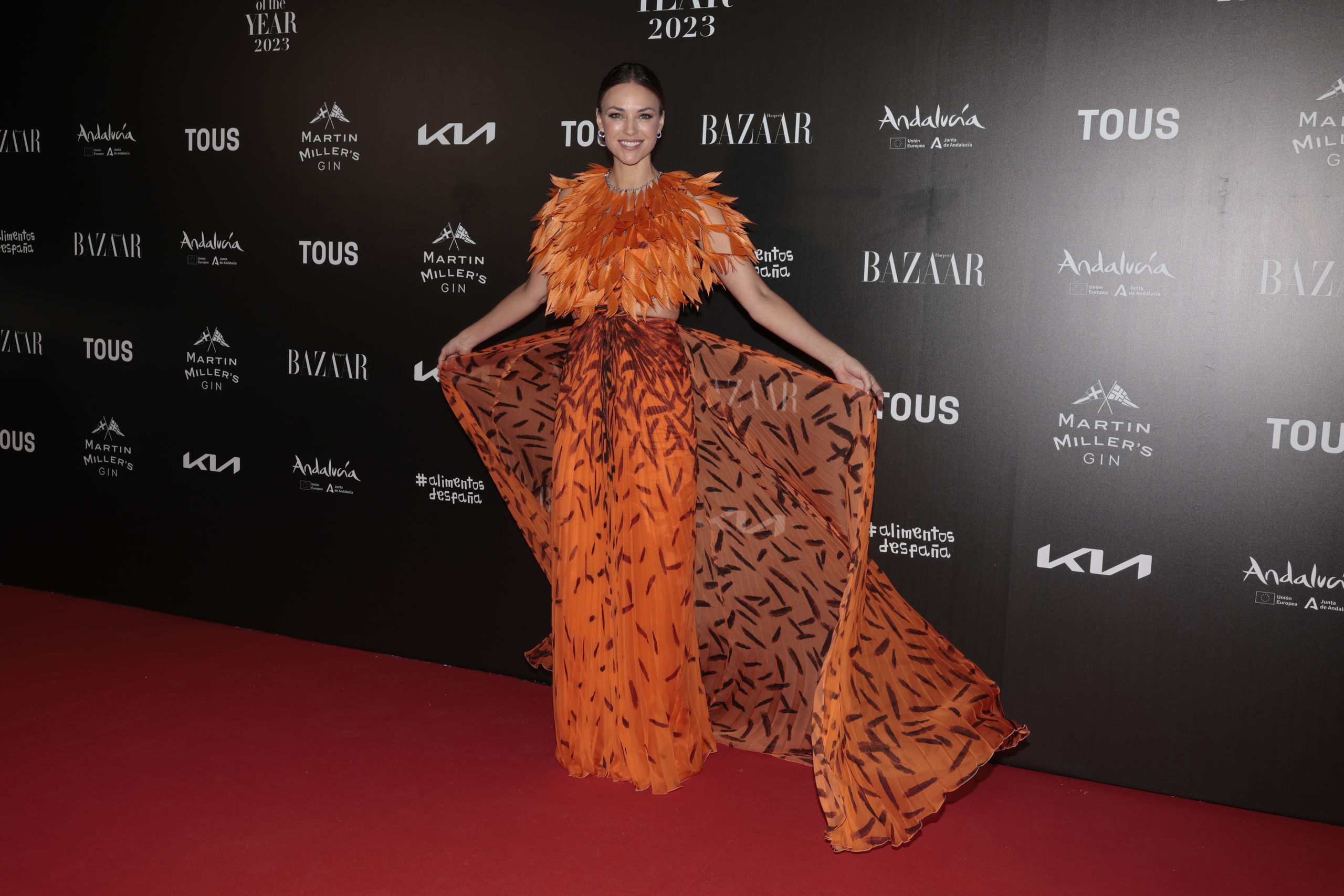 La modelo ha apostado por un espectacular vestido naranja de Isabel Sanchis que parecía una oda al otoño, por su parte superior formada por hojas en 3d y la falda de gasa con cola desde la cadera dándole el toque vaporoso al diseño.