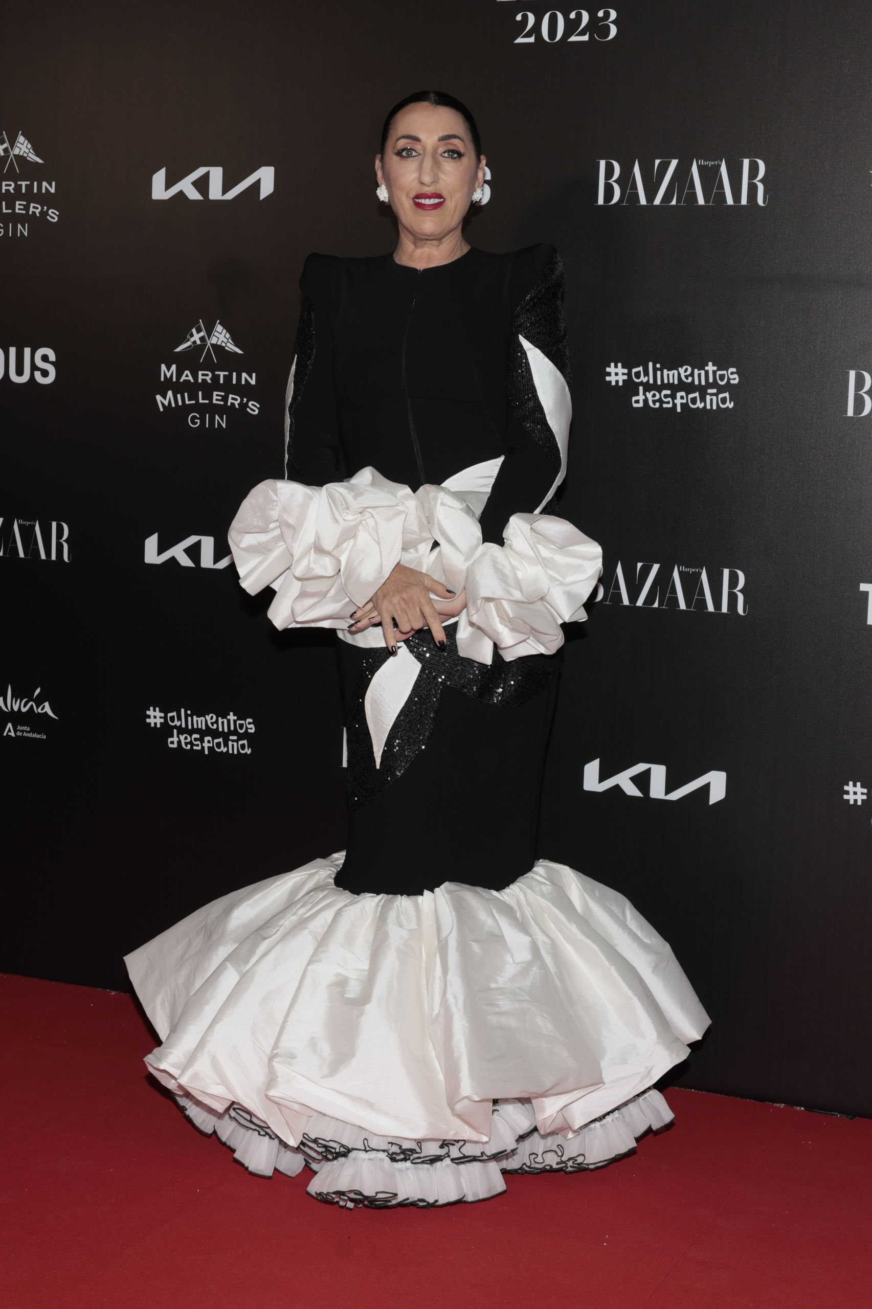 La actriz ha acaparado todas las miradas con un original vestido de inspiración flamenca bicolor con maxi volantes en blanco en los puños y en el bajo de la falda, hombrera estructurada y detalle de flor en la parte frontal.