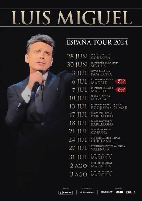 Luis Miguel tiene ya perfectamente dibujada su gran gira en España en 2024. Su presencia en nuestro país, que dio comienzo con un único gran concierto en el Santiago Bernabéu que luego amplió a dos -ambos ya agotados- incorpora conciertos en Córdoba, Marbella y más ciudades.