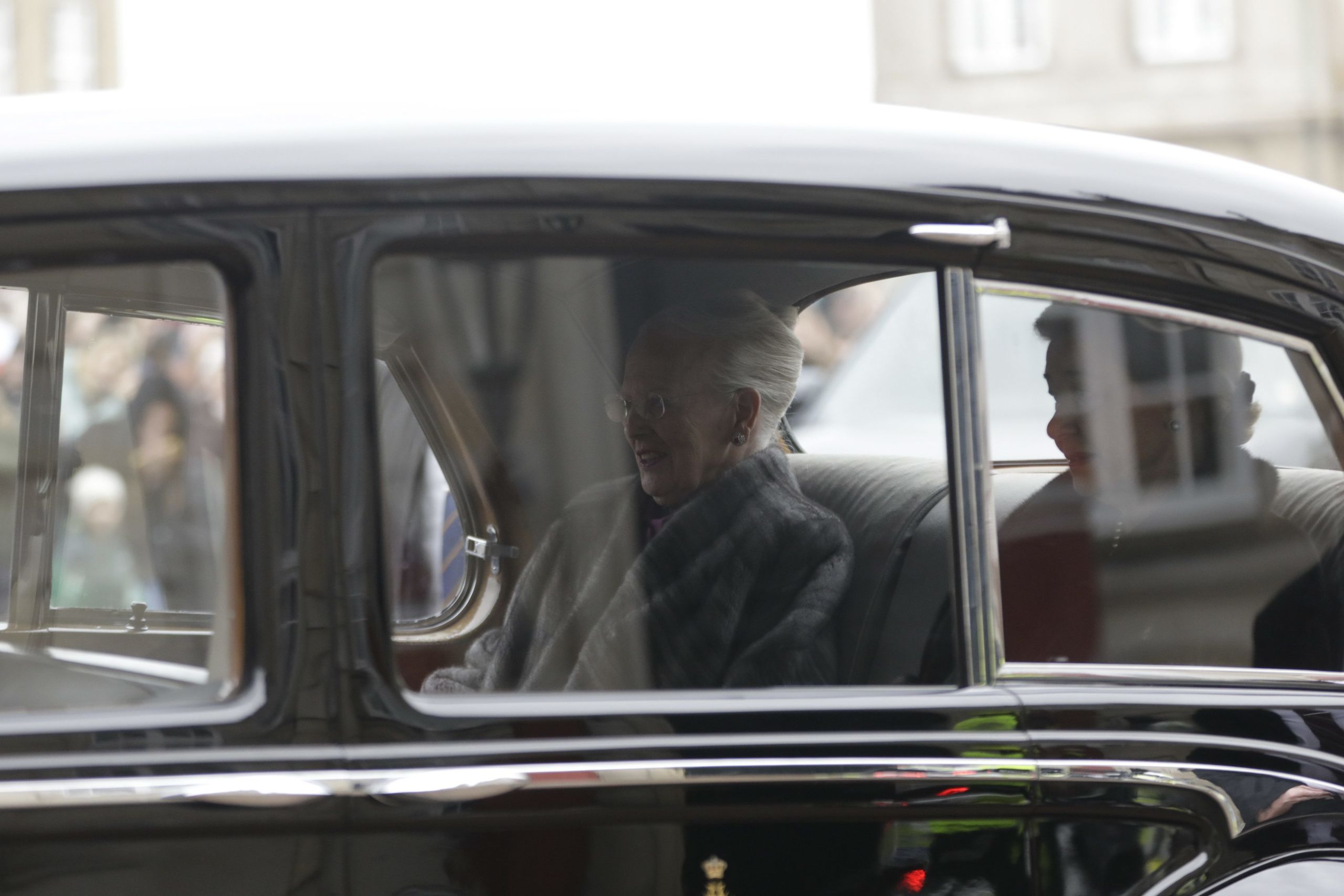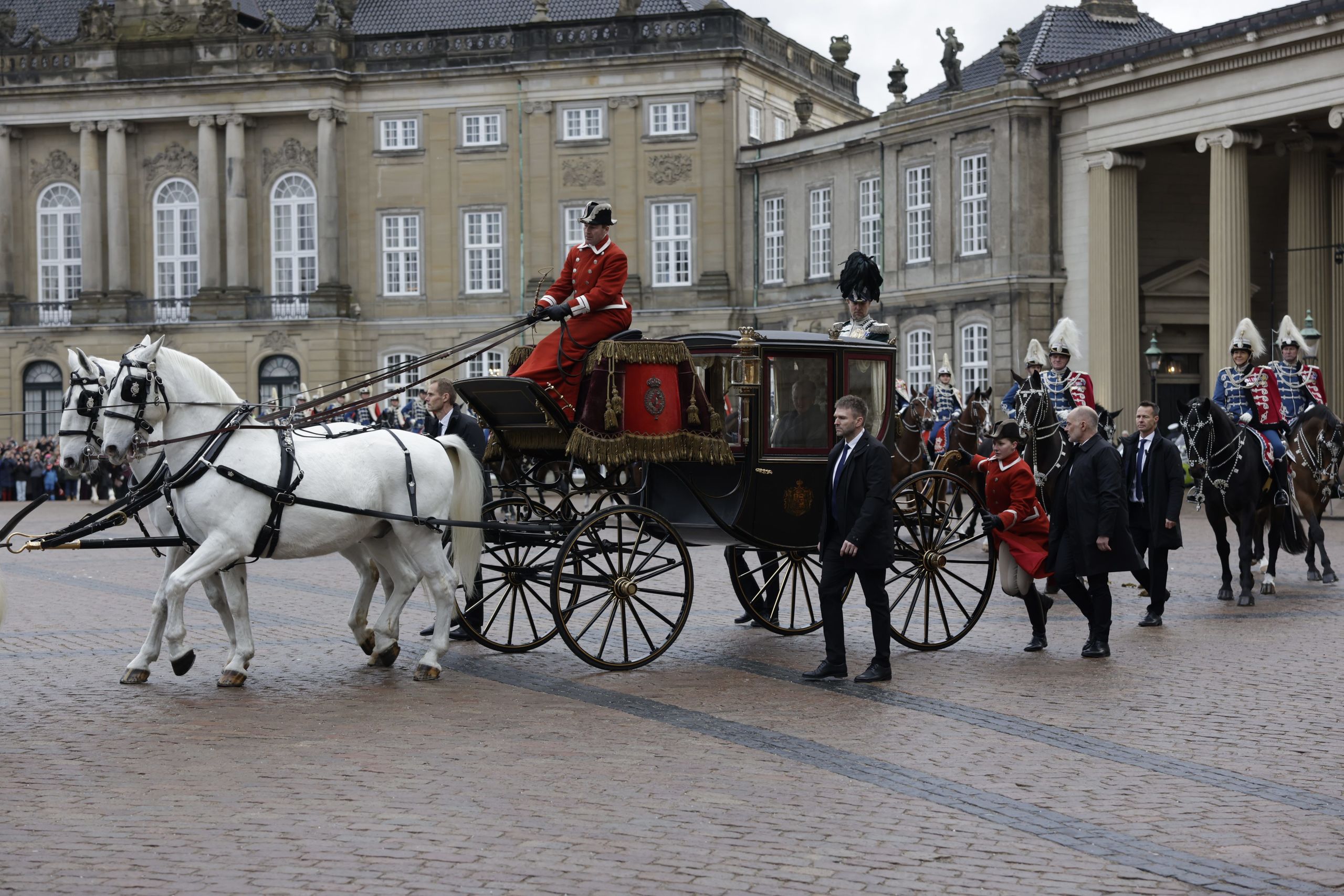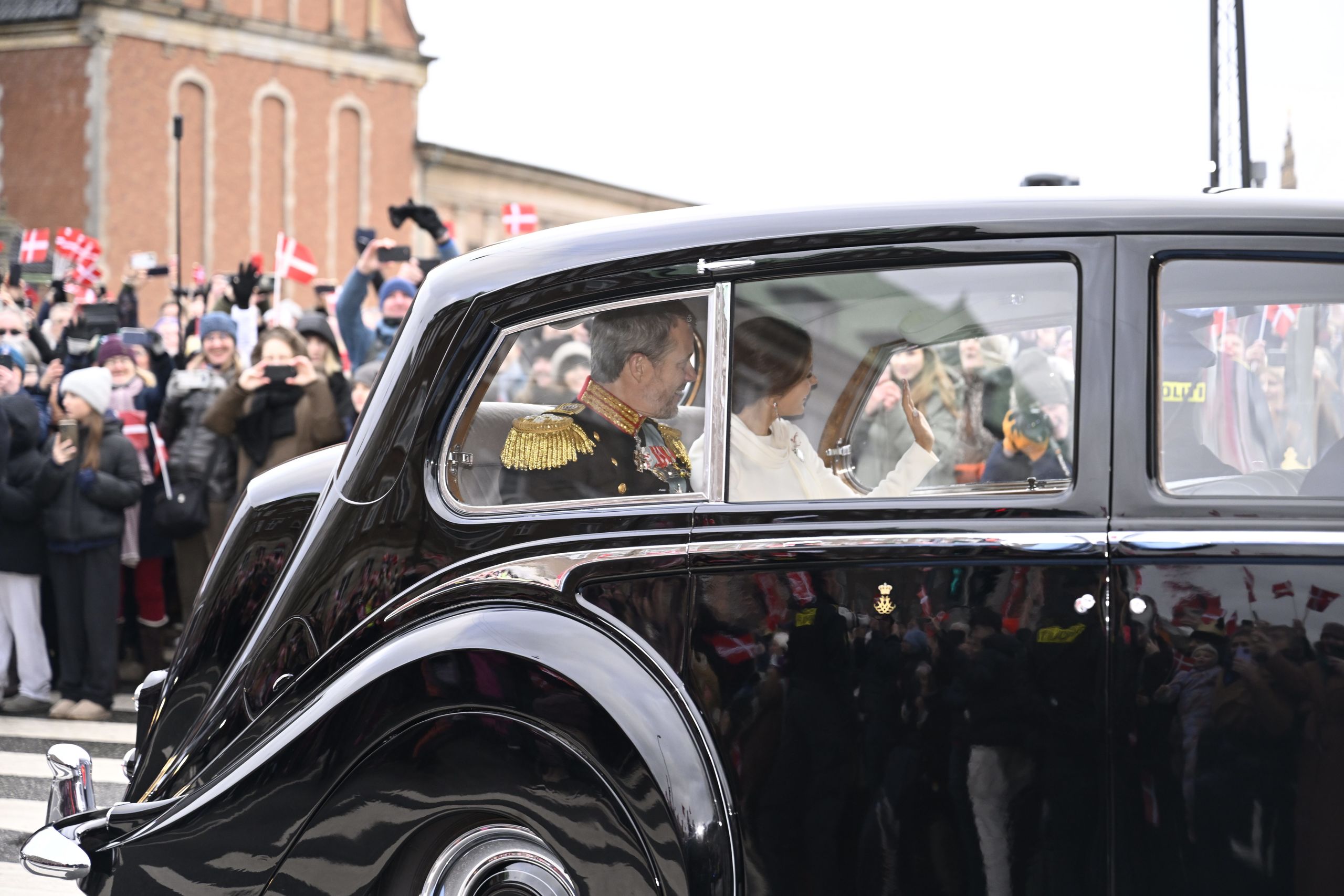 El vehículo que transporta a la pareja real conduce desde el Castillo de Amalienborg hasta el Castillo de Christiansborg para el cambio de trono.