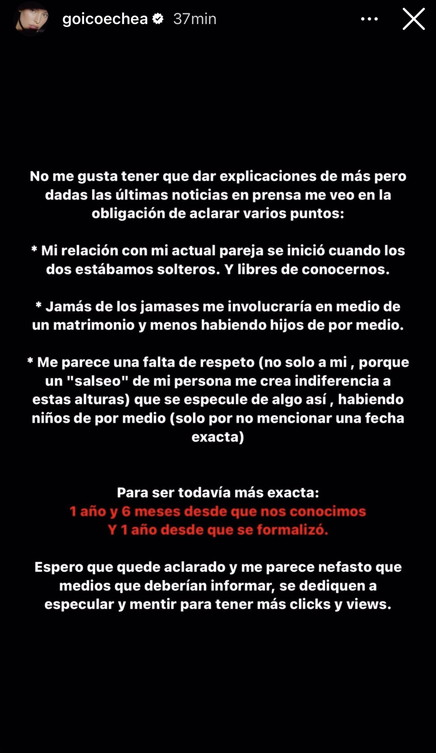 Ante la creciente especulación, Goicoechea se ha visto "obligada" a abordar la situación a través de un comunicado. En sus palabras, la influencer afirma que la relación con el deportista comenzó cuando ambos estaban "solteros y libres". Además, ha expresado su molestia por las insinuaciones que sugieren su involucramiento en el divorcio de su pareja con su exmujer, calificándolo como una "falta de respeto", especialmente considerando la presencia de niños de por medio.