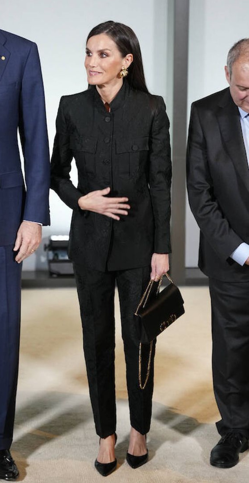 La reina ha lucido un impresionante dos piezas -un traje de chaqueta y pantalón- de la firma Dries Van Noten, la firma belga que Puig adquirió en 2018. En cuanto a complementos, ha optado por unos altísimos tacones y un bolso de Carolina Herrera.