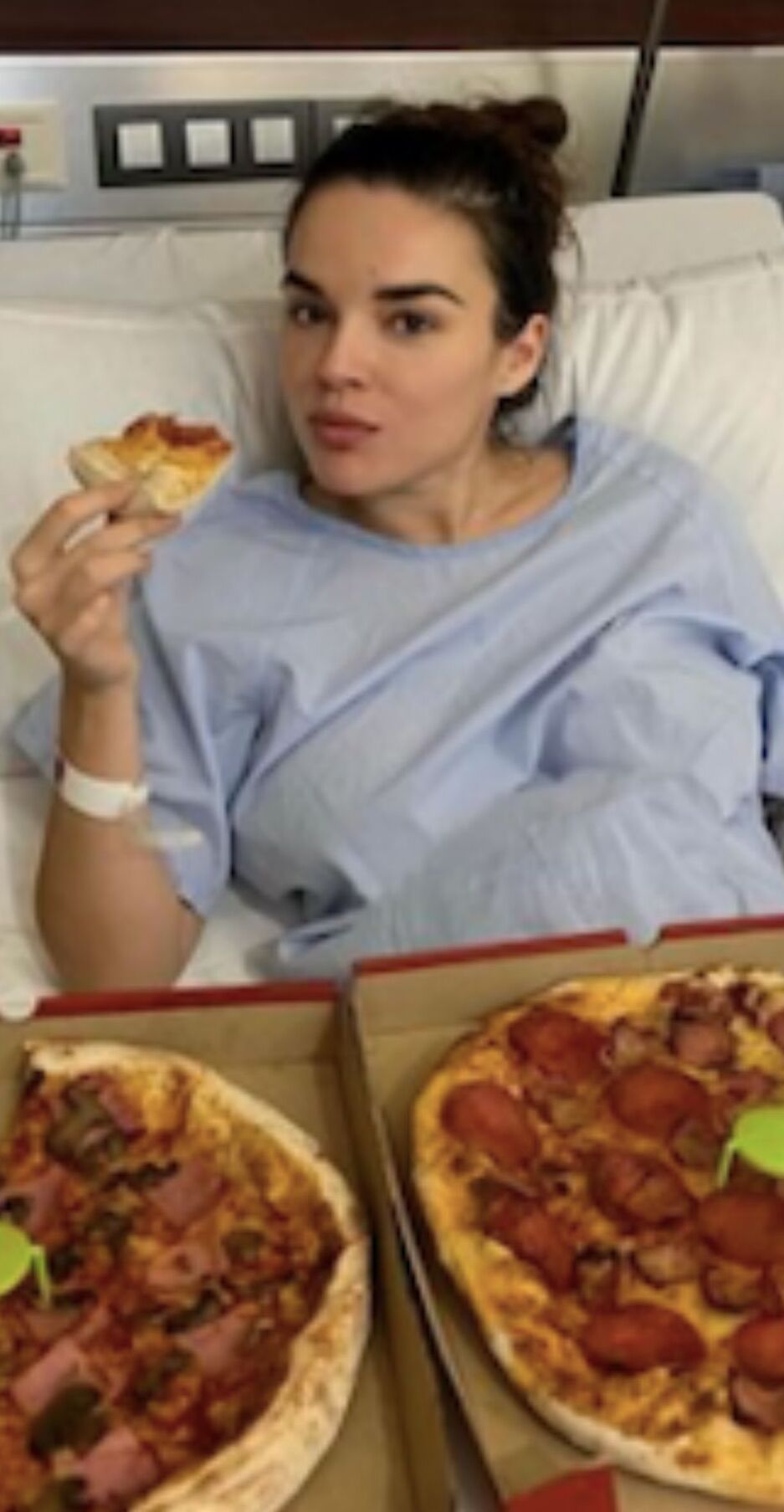 Durante todo el embarazo ha cuidado mucho la alimentación, pensando en la salud de su bebé, pero una vez que ya ha tenido a su primer retoño ha pedido dos pizzas en el mismo hospital para celebrarlo, mostrando el antojo tan grande que tenía. Una de pepperoni y otra de jamón y champiñones.