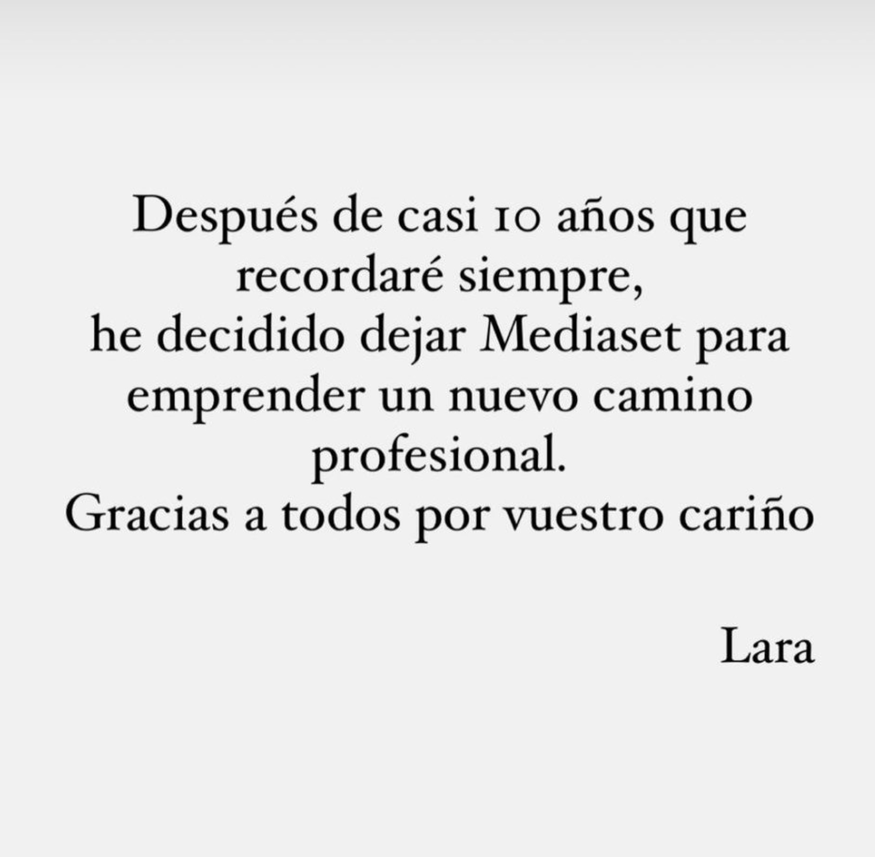 Mediaset España pierde uno de sus rostros más conocidos: Lara Álvarez abandona el grupo de comunicación después de diez años para comenzar una nueva andadura profesional, tal y como ella misma confirmado en sus redes sociales: "Después de casi 10 años que recordaré siempre, he decidido dejar Mediaset para emprender un nuevo camino profesional. Gracias a todos por vuestro cariño".
