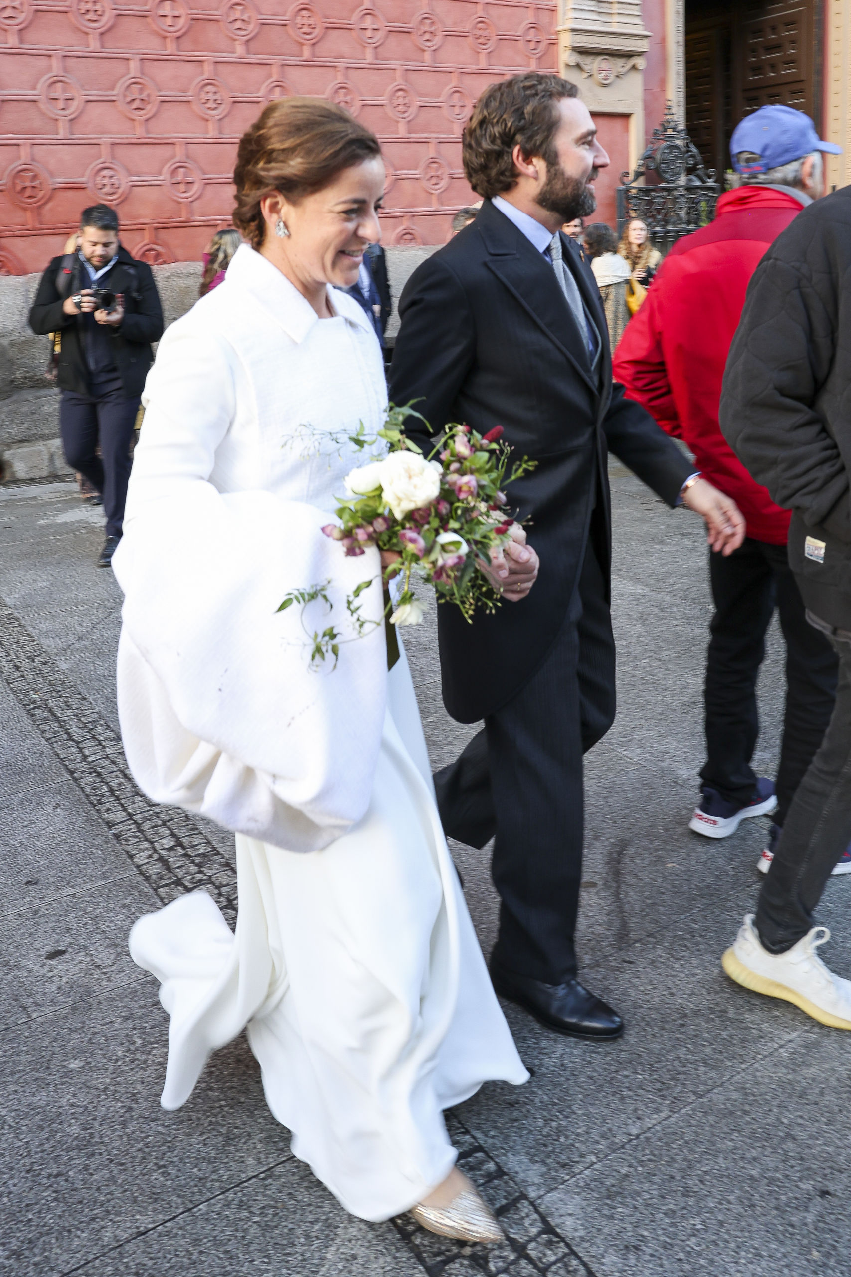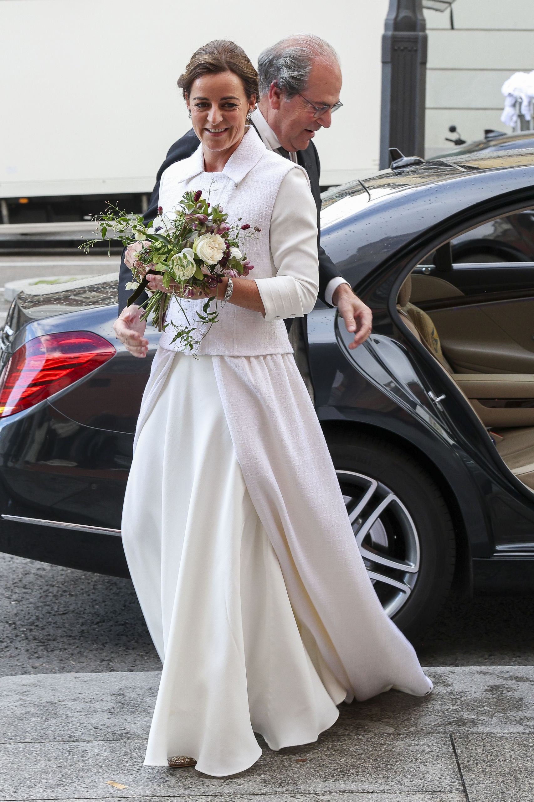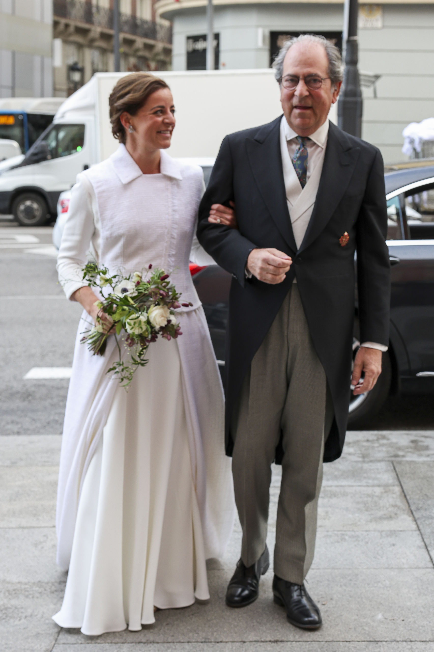 Ina Morenés llega del brazo del orgulloso padrino. Para un día tan especial la novia ha lucido un diseño de Navascués, uno de los talleres favoritos de la alta sociedad madrileña para vestir en sus bodas. Cristina Martínez-Pardo, la directora creativa de la marca, estuvo detrás de otros looks nupciales como el de Belén Corsini o Lulu Figueroa.