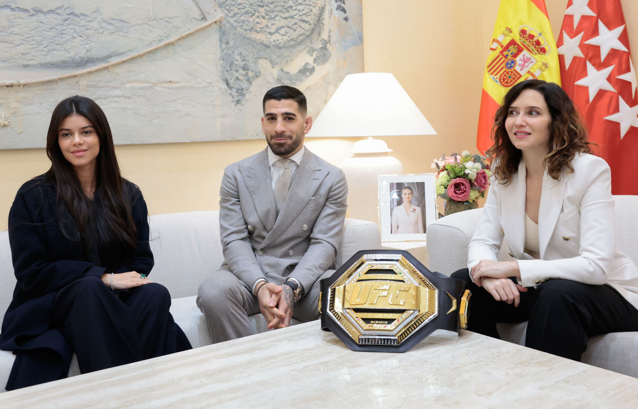 La presidenta de la Comunidad de Madrid, Isabel Díaz Ayuso, ha recibido este lunes en la sede del Gobierno regional al luchador hispano-georgiano Ilia Topuria, recientemente proclamado campeón del mundo del peso pluma de la UFC, la mayor competición de artes marciales mixtas, y al que ha agradecido dar a España "semejante triunfo".