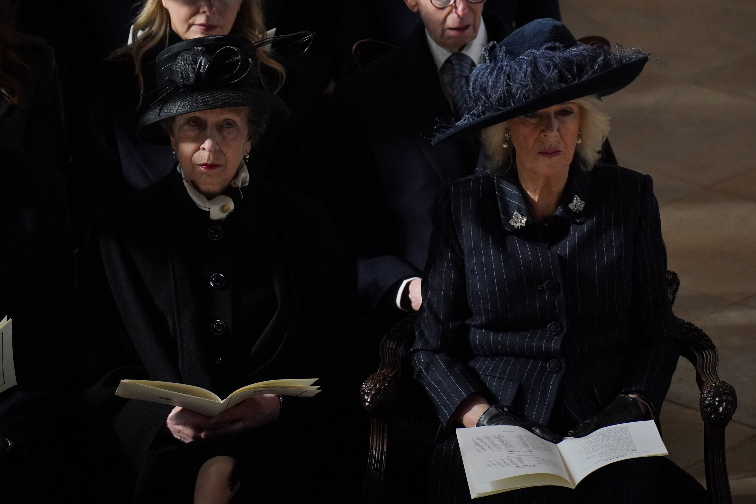 Carlos III no estuvo en la misa debido al tratamiento del cáncer que padece. Tampoco asistió el príncipe heredero Guillermo, ahijado de Constantino de Grecia, ni su esposa Kate Middleton por razones de salud. En la imagen, la reina Camilla y su cuñada, la princesa Ana.