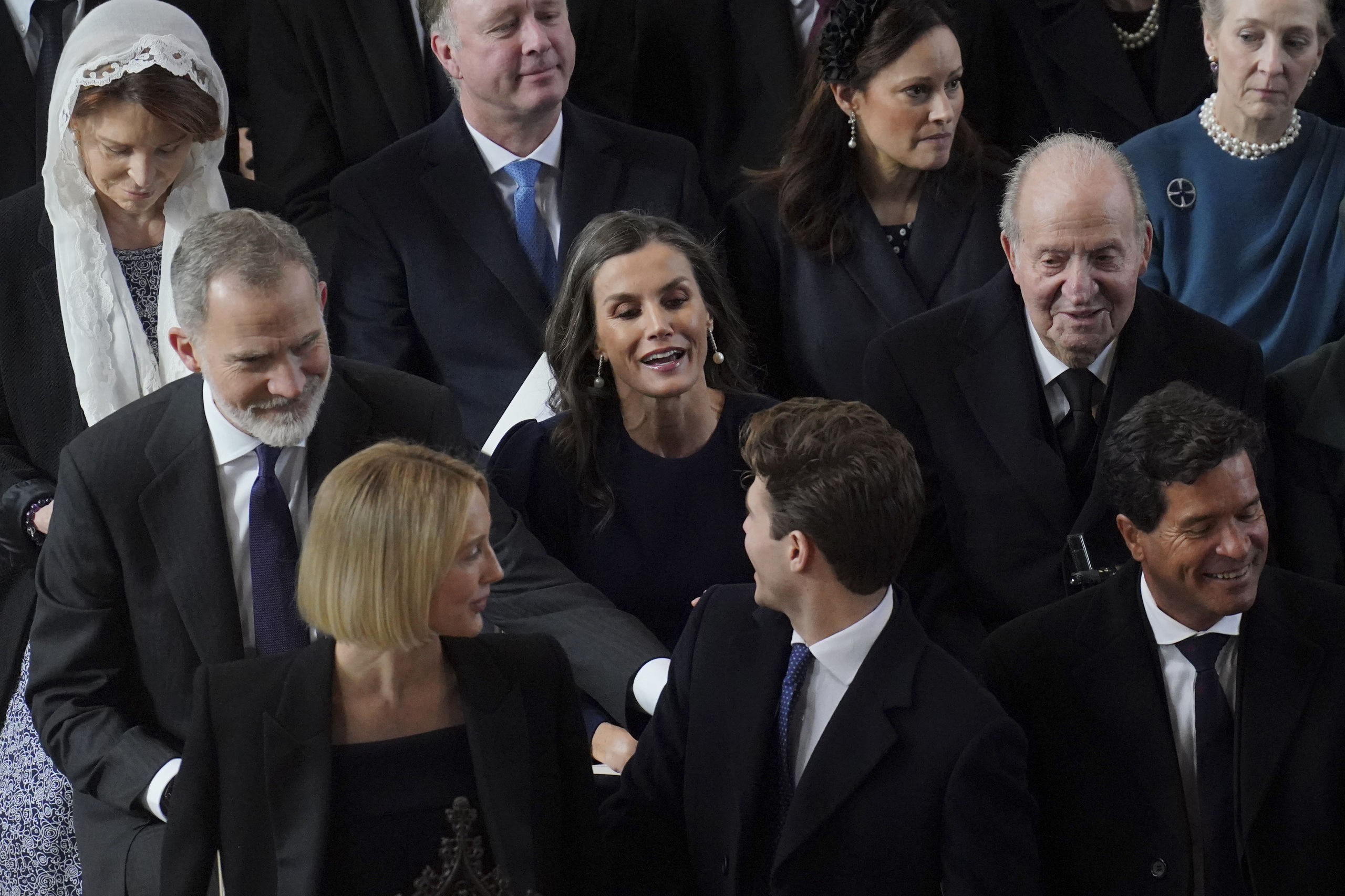Los Reyes saludando a los hijos de Constantino II de Grecia, situados en la primera fila junto a la reina emérita Sofía (a quien saluda cariñosamente doña Letizia) y su hermana, la princesa Irene.