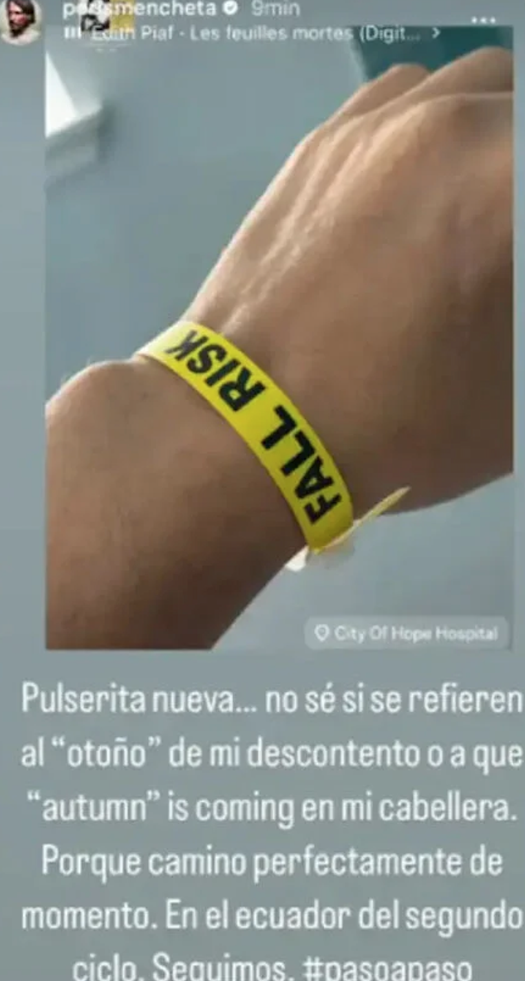 Desde el Hospital City of Hope asegura que se encuentra envuelto en un nuevo ciclo de quimioterapia, el segundo, que puede tener efectos secundarios. Por eso muestra una pulsera donde se lee "Fall risk", o "riesgo de caída". "Pulserita nueva… No sé si se refieren al ‘otoño’ de mi descontento o a que ‘autumn’ is coming en mi cabellera. Porque camino perfectamente, de momento, en el ecuador del segundo ciclo. Seguimos", dice, echando mano de buen ánimo y hasta sentido del humor.