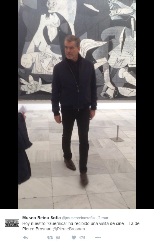 Pierce Brosnan ha estado de vacaciones por Madrid y durante su estancia visitó la exposición del pintor Ingress en el Museo de El Prado y en el Reina Sofía, lugar donde fue fotografiado por el museo junto a la obra el Guernica de Pablo Picasso, algo que sentó muy mal a los usuarios. "Hoy nuestro Guernica ha recibido una visita de cine… La de Pierce Brosnan", publicó el museo acompañándolo de la imagen de él junto a la obra.