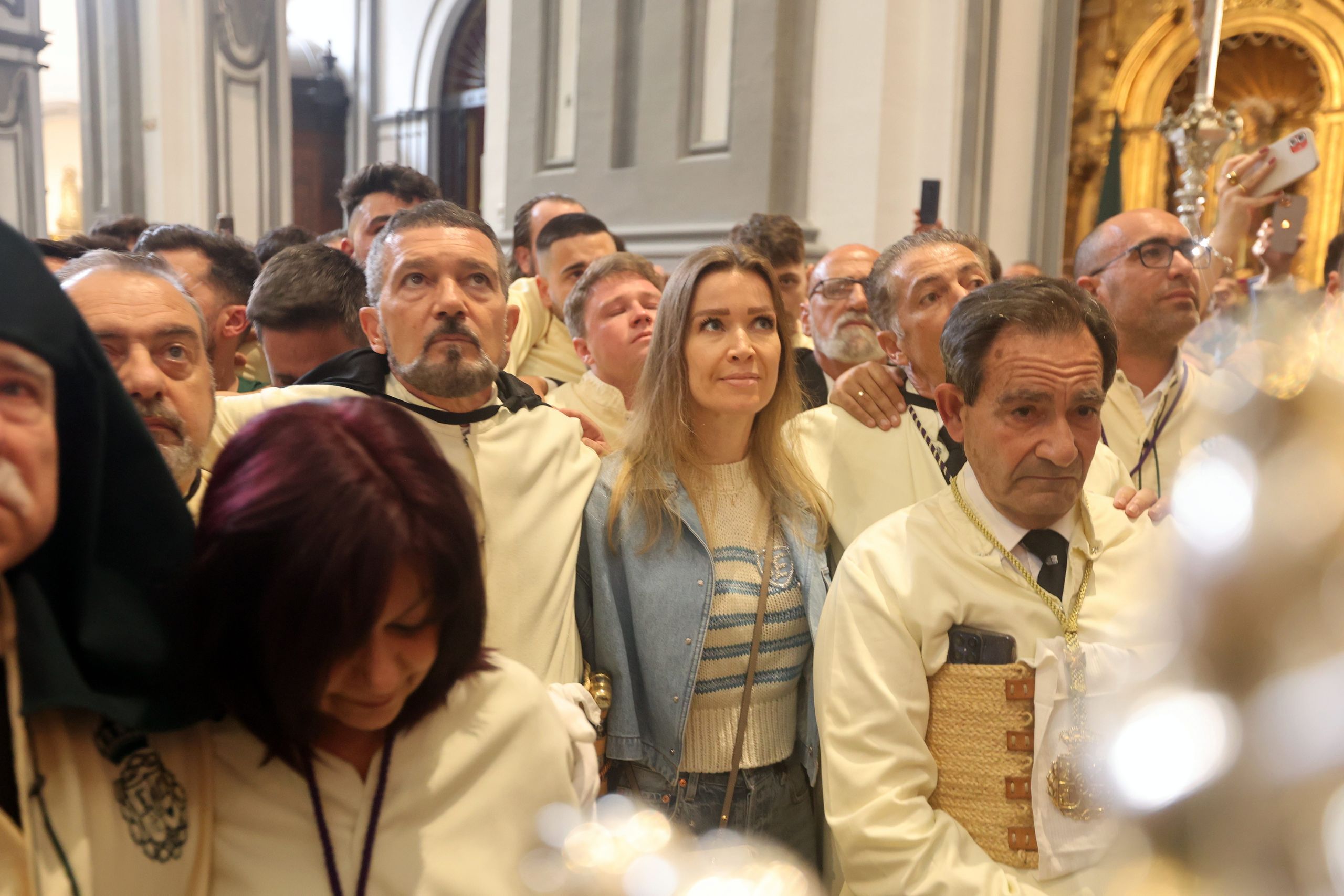 La Cofradía celebró la ceremonia del Domingo de Ramos como todos los años. Antonio Banderas saludaba a los allí presentes, ya vestido para la ocasión y acompañado de su inseparable pareja, Nicole Kimpel. Cogidos de la mano, esperaban pacientemente a que diera comienzo la ceremonia. Agarrados por los hombros, la pareja se movía al ritmo de la orquesta y entonaban, junto al resto de los allí presentes, el Himno Lágrimas de San Juan.