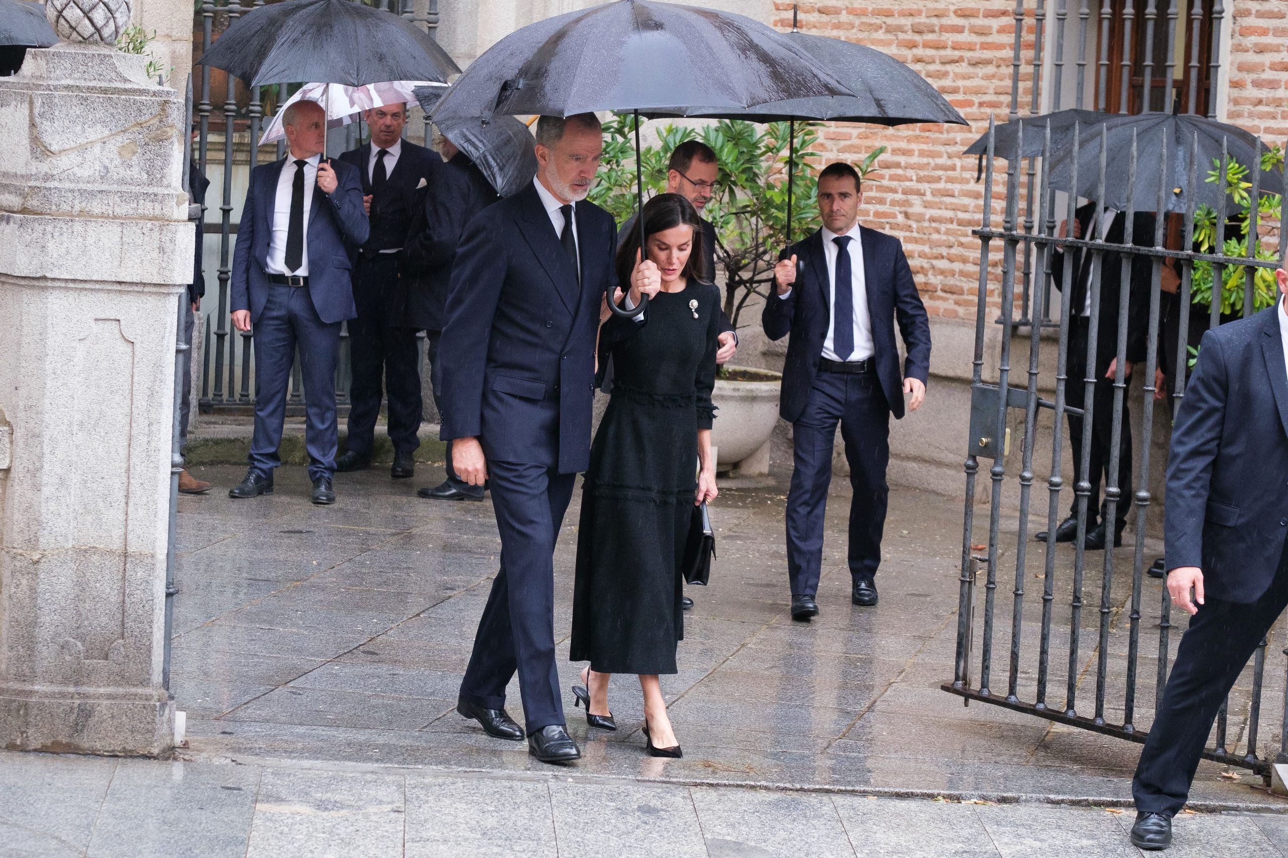 Después de la celebración de la misa, el rey Felipe VI y la reina Letizia eran de los primeros en marcharse. Lo hacían bajo el resguardo de un paraguas para evitar mojarse y el rey tenía un bonito gesto con su esposa. Al llegar al coche, le sujetaba pacientemente el paraguas hasta que ella estaba dentro del vehículo, ayudando a que no se mojara.