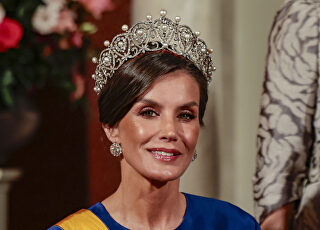 Puesto que los saludos a los cerca de 220 invitados al banquete iban a durar unos 45 minutos, doña Letizia, con vestido de noche y tiara, optó por adoptar una postura más descansada y se sentó en una silla, mientras que Felipe VI y los reyes neerlandeses, Guillermo Alejandro y Máxima, permanecieron de pie. También estaba ya sentada al entrar los reyes de Holanda y don Felipe en el salón del banquete.
