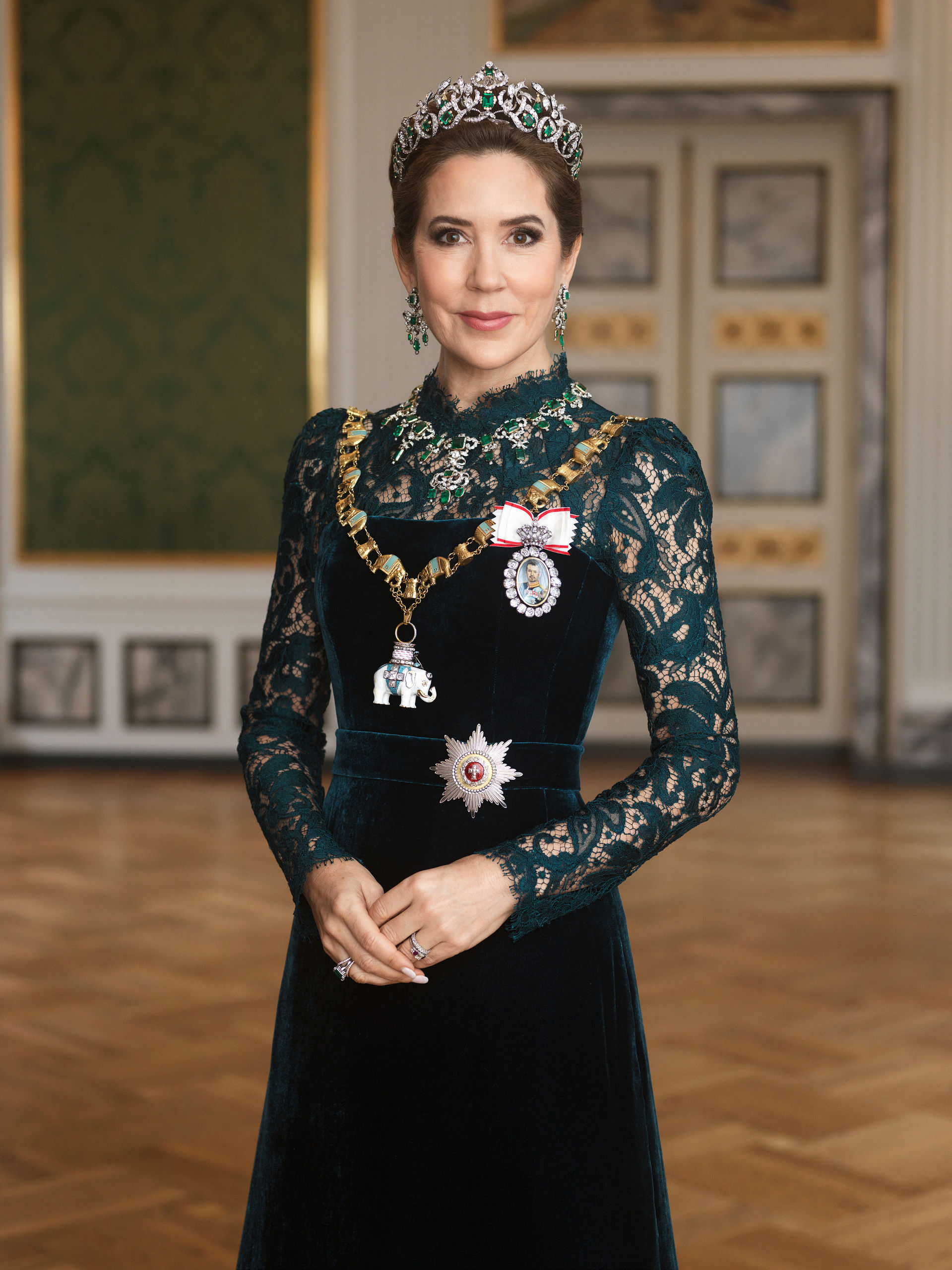 En las fotografías vemos a Mary de Dinamarca luciendo un favorecedor vestido con transparencias y luciendo la Orden del Elefante, la más alta distinción de su país. Además, luce por primera vez las joyas de la corona: un espectacular conjunto de esmeraldas con tiara, collar, pendientes y un gran broche. En su pecho, la reina Mary luce un pequeño retrato de su esposo junto a un lazo que representa a la Orden de Dannebrog. Se trata de una tradición que ha existido durante generaciones, pues las mujeres de la Familia Real siempre han llevado en su pecho un retrato en miniatura del monarca. En su época como prometida del heredero al trono, la australiana llevó un retrato de la reina Margarita.