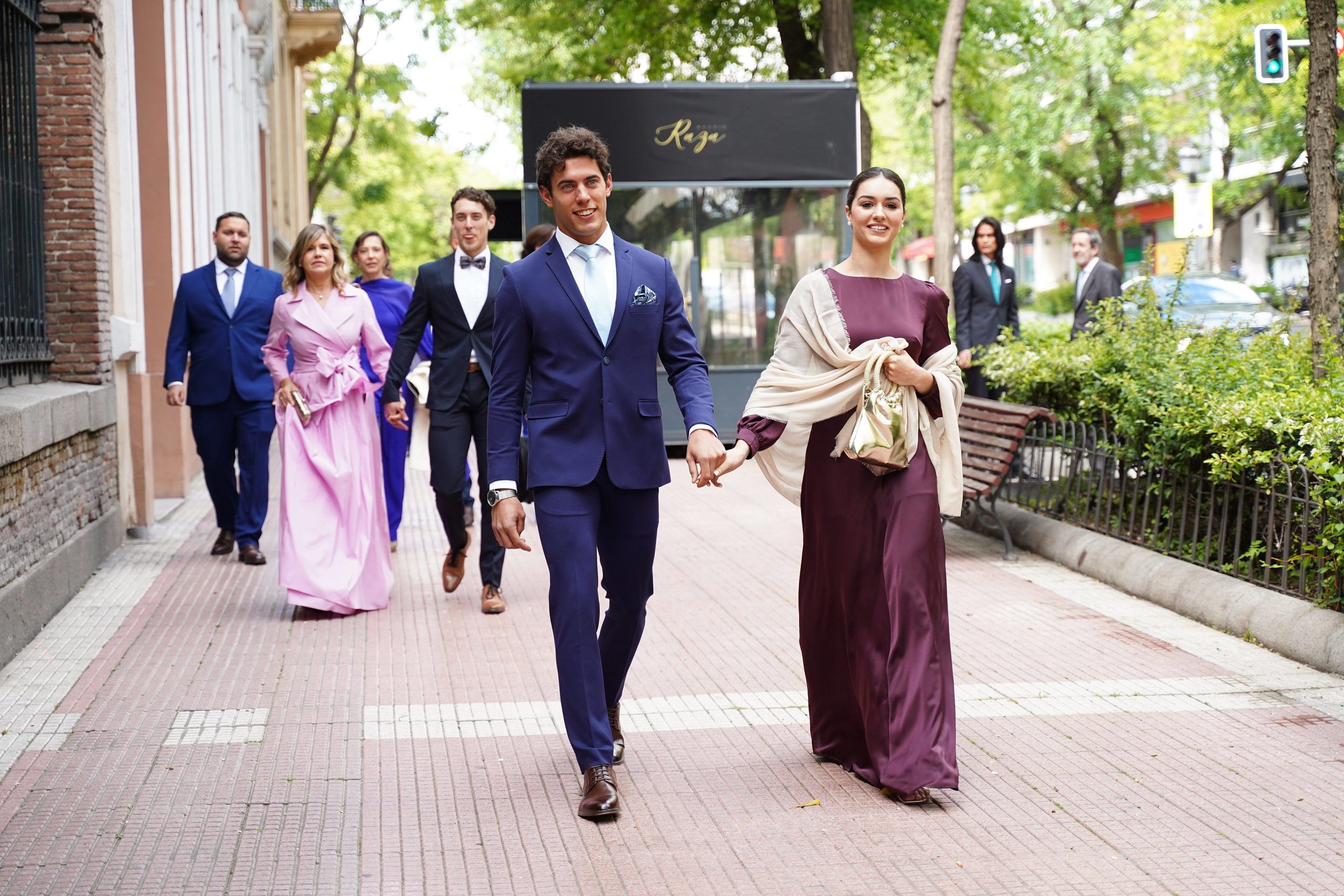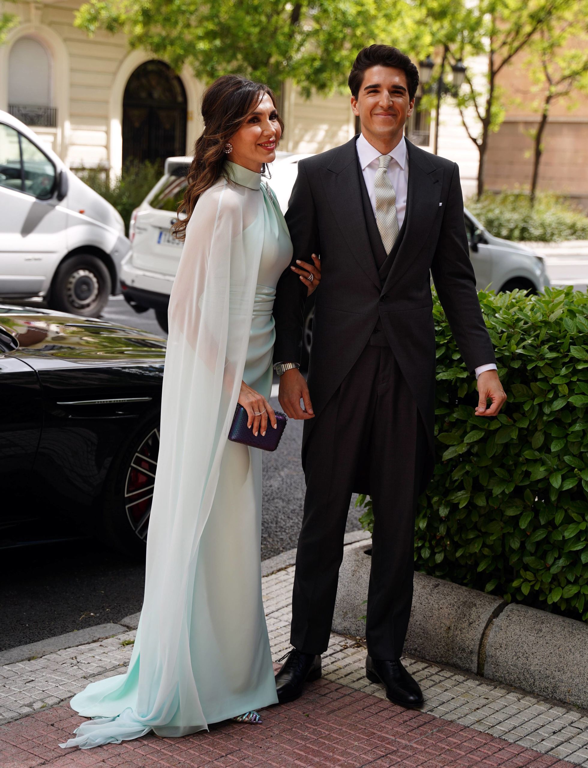 Javier García Obregón, con el clásico chaqué oscuro, con chaleco del mismo color, combinado con corbata en tonos claros sobre camisa blanca. La madrina, Paloma Lago, muy elegante con vestido de Anmargo en color verde menta, fruncido en la cintura.