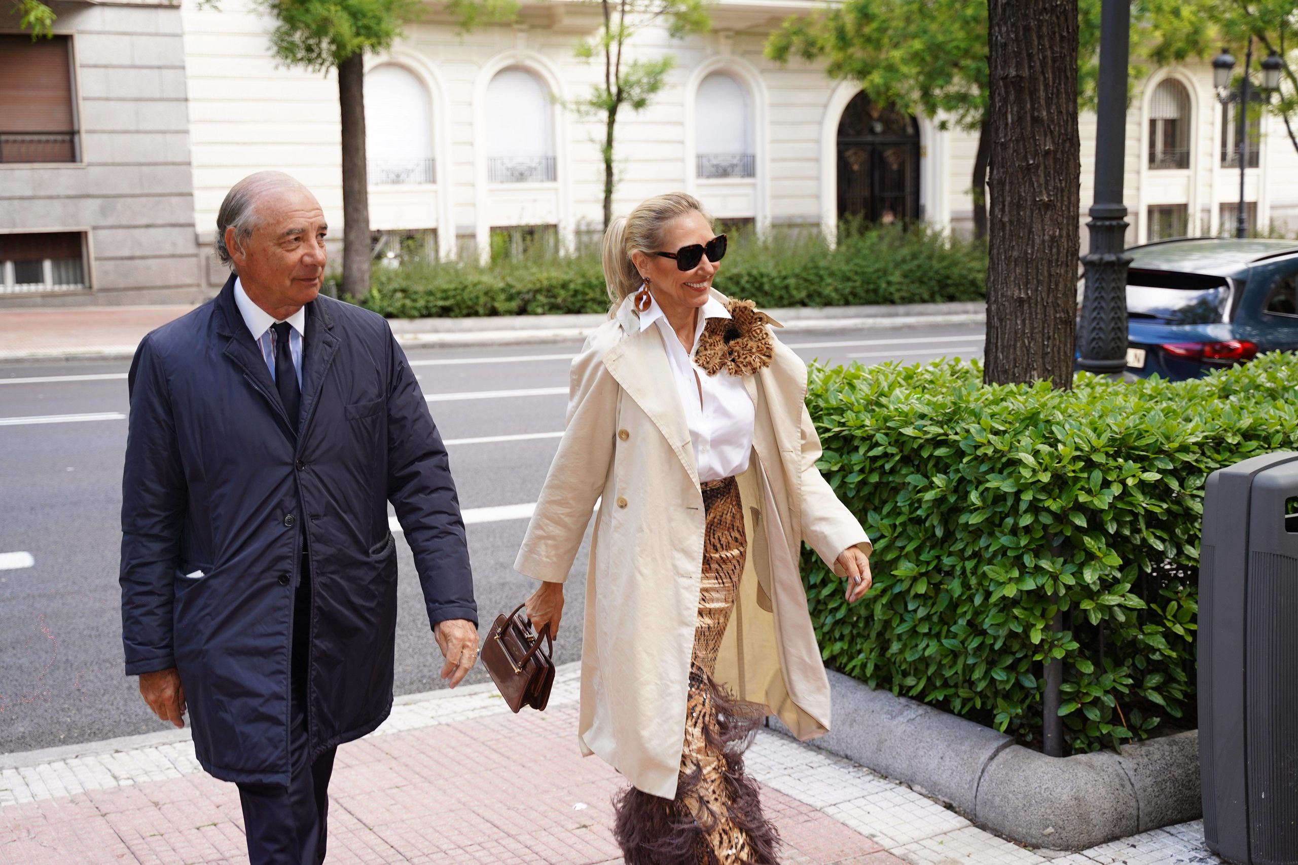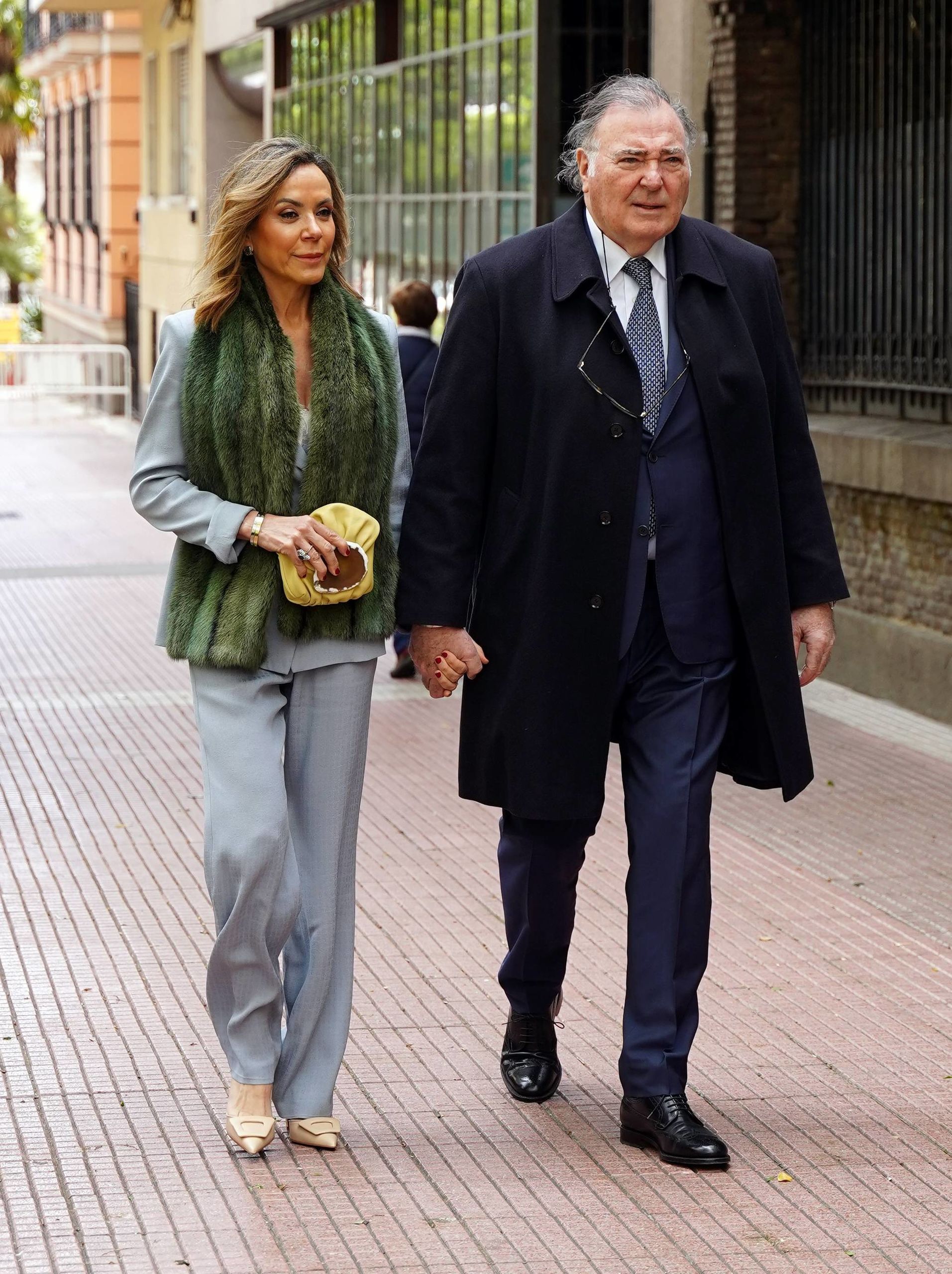 Juancho García Obregón, el hermano mayor del clan, tío del novio, ha llegado a la iglesia de la mano de su mujer, Marta Vázquez de Castro, muy elegante en traje pantalón, bolso bracelet de Loewe, una estola en tonos verdes.