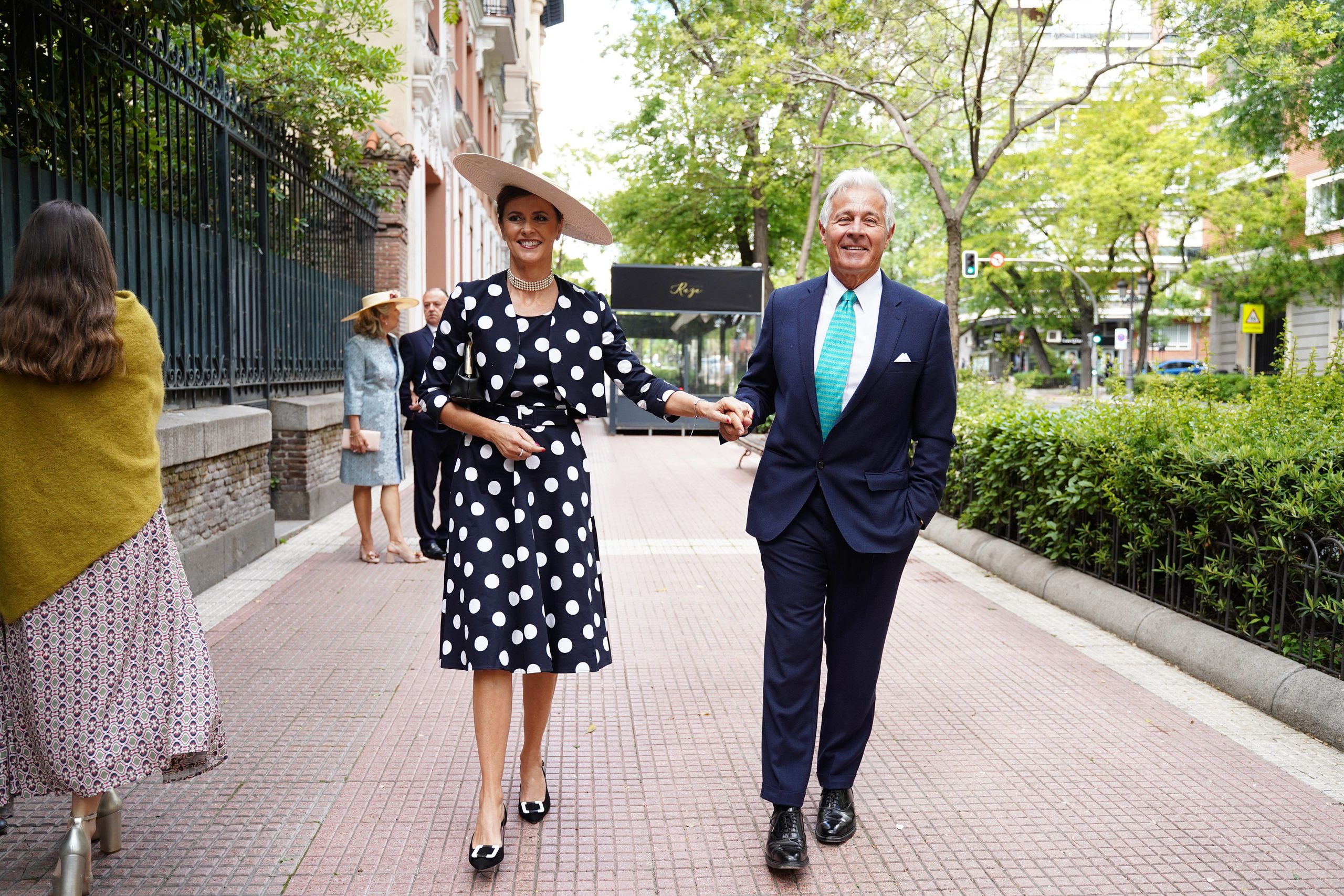 Nuria March, acompañanada de su marido Don Johnston, iba muy elegante con vestido azul marino de lunares blancos por debajo de la rodilla, que ha combinado con una chaqueta de manga francesa tipo "torera" a juego. Como tocado, un sombrero ladeado de color beige.