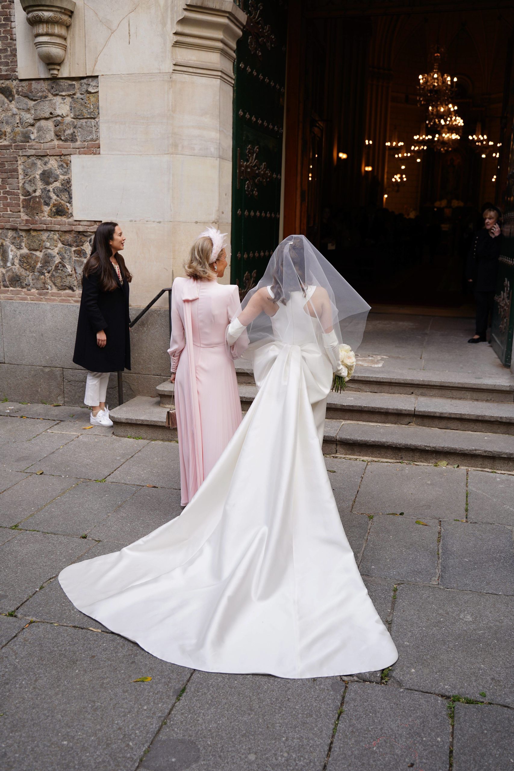 Eugenia Gil entra del brazo de su madre en la iglesia de San Fermín de los Navarros. Aquí podemos apreciar la falda con larga cola que nacía de una gran lazo trasero. El detalle más original ha sido los guantes de color blanco.