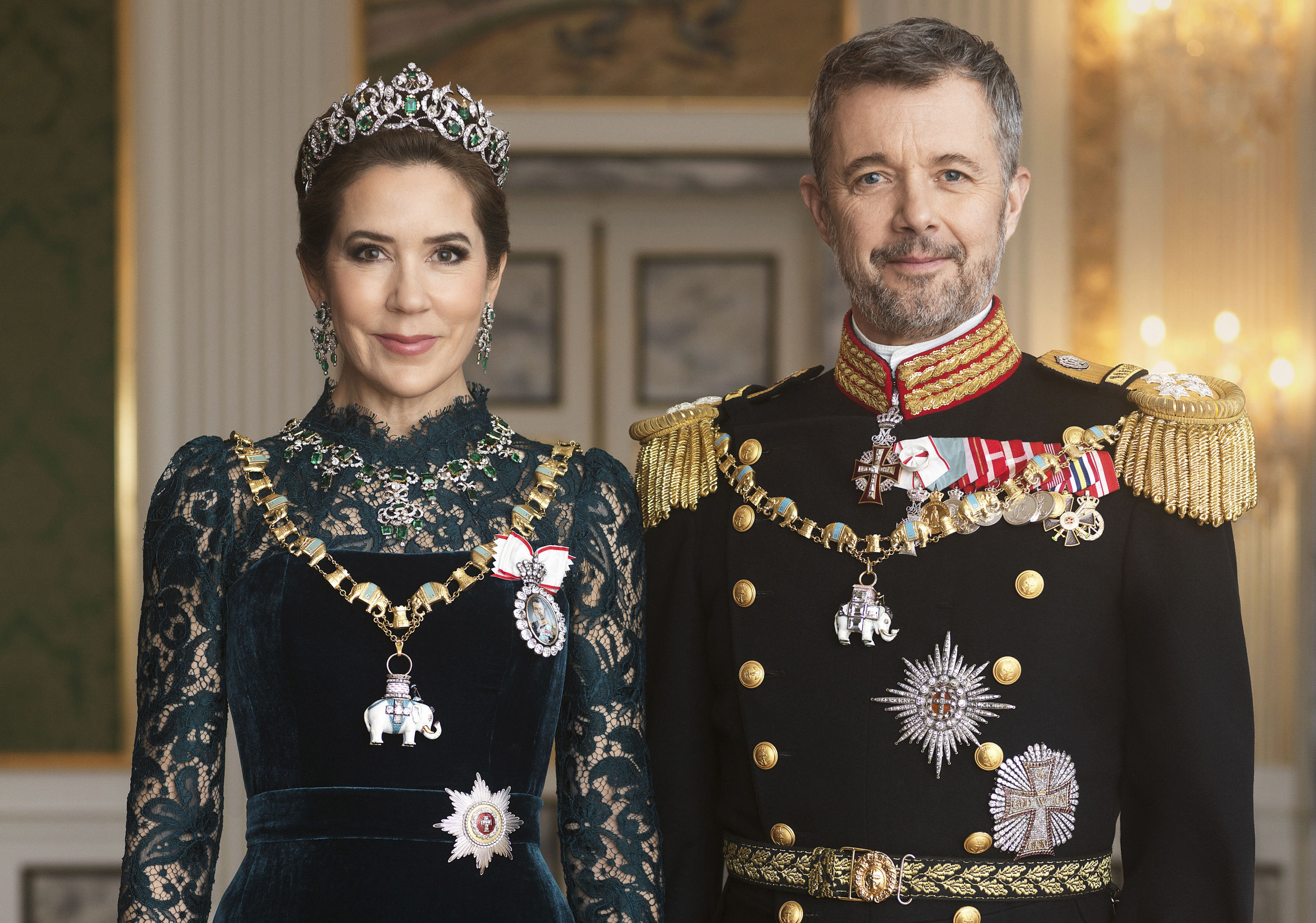 Federico y Mary de Dinamarca en su primer retrato oficial de gala. Federico X viste con uniforme militar de gala de la Marina, con la gran cruz de comandante de Dannebrog, y collar de la Orden del Elefante y estrella de la Orden danesa. La reina Mary aparece con un vestido palabra de honor y encaje en terciopelo en verde oscuro, anillo de compromiso, y un espectacular aderezo de esmeraldas que se remontan a la época de la reina Sofía Magdalena, esposa de Christian VI, quien decidió en su testamento en 1746 dispuso que estas joyas fueran para las reinas de Dinamarca. Asimismo, lleva un retrato en miniatura de su marido, tal y como marca en la Familia Real danesa.