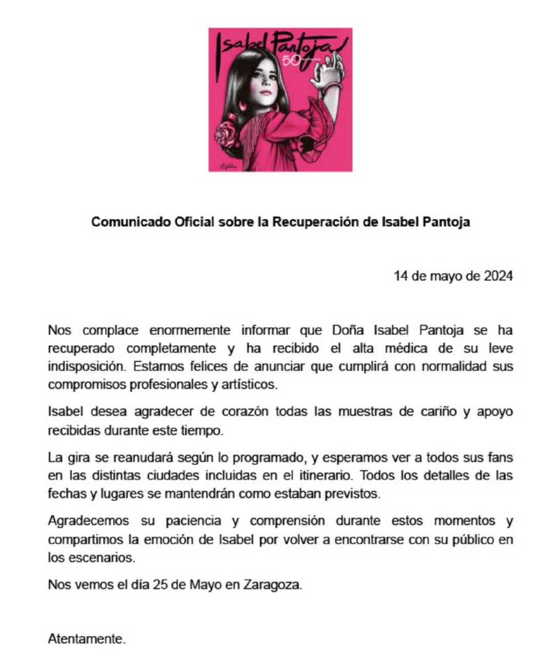 Unos días después de la cancelación y con todos sus seguidores pendientes de su evolución, la tonadillera ha emitido un comunicado al que ha tenido acceso este medio donde aclara cómo se encuentra y cuáles son sus planes de futuro en cuanto a sus próximos conciertos: "Nos complace enormemente informar que doña Isabel Pantoja se ha recuperado completamente y ha recibido el alta médica de su leve indisposición. Estamos felices de anunciar que cumplirá con normalidad sus compromisos profesionales y artísticos", dice el texto, asegurando que la cantante está completamente recuperada.
