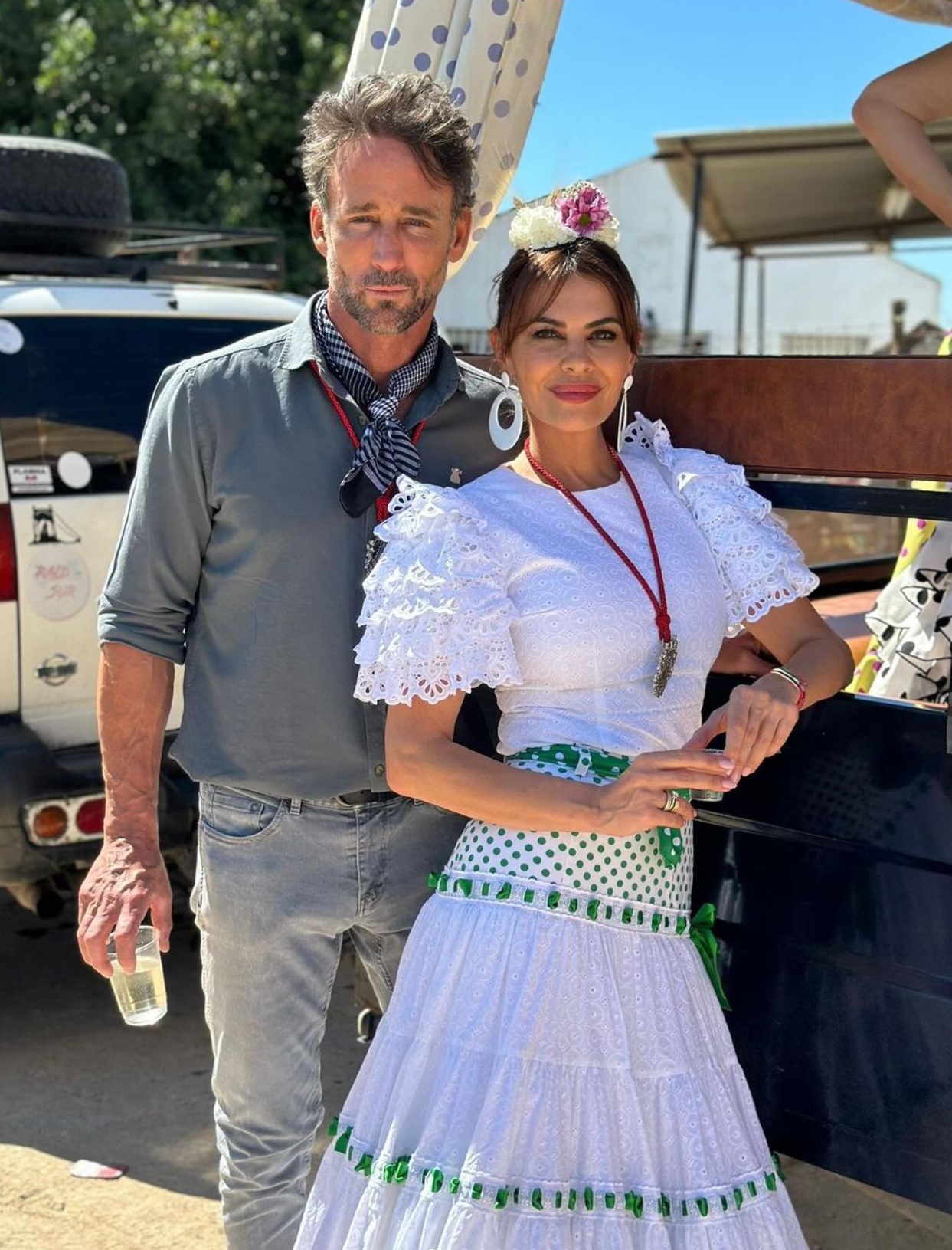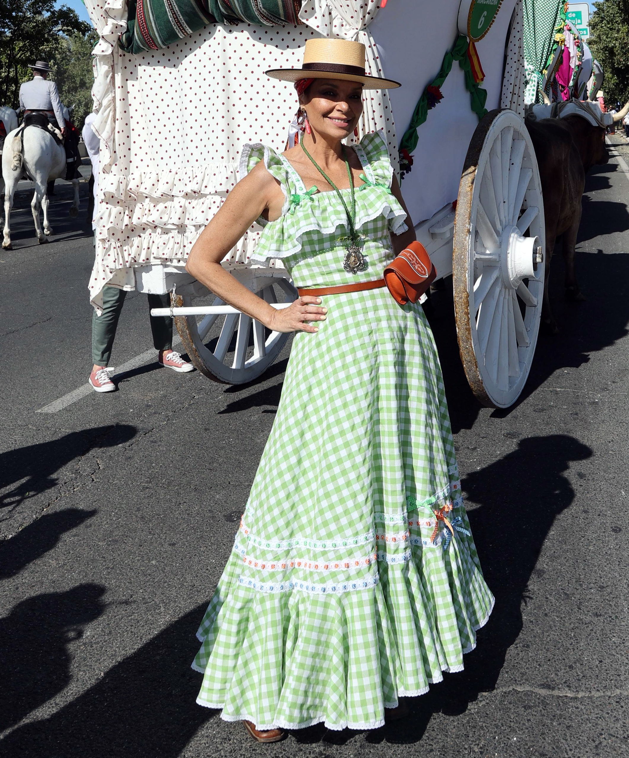 La modelo, presentador y exconcursante de Gran Hermano vive un año más el peregrinaje ataviada con un veraniego vestido flamenco con un estampado de cuadros blancos y verdes.