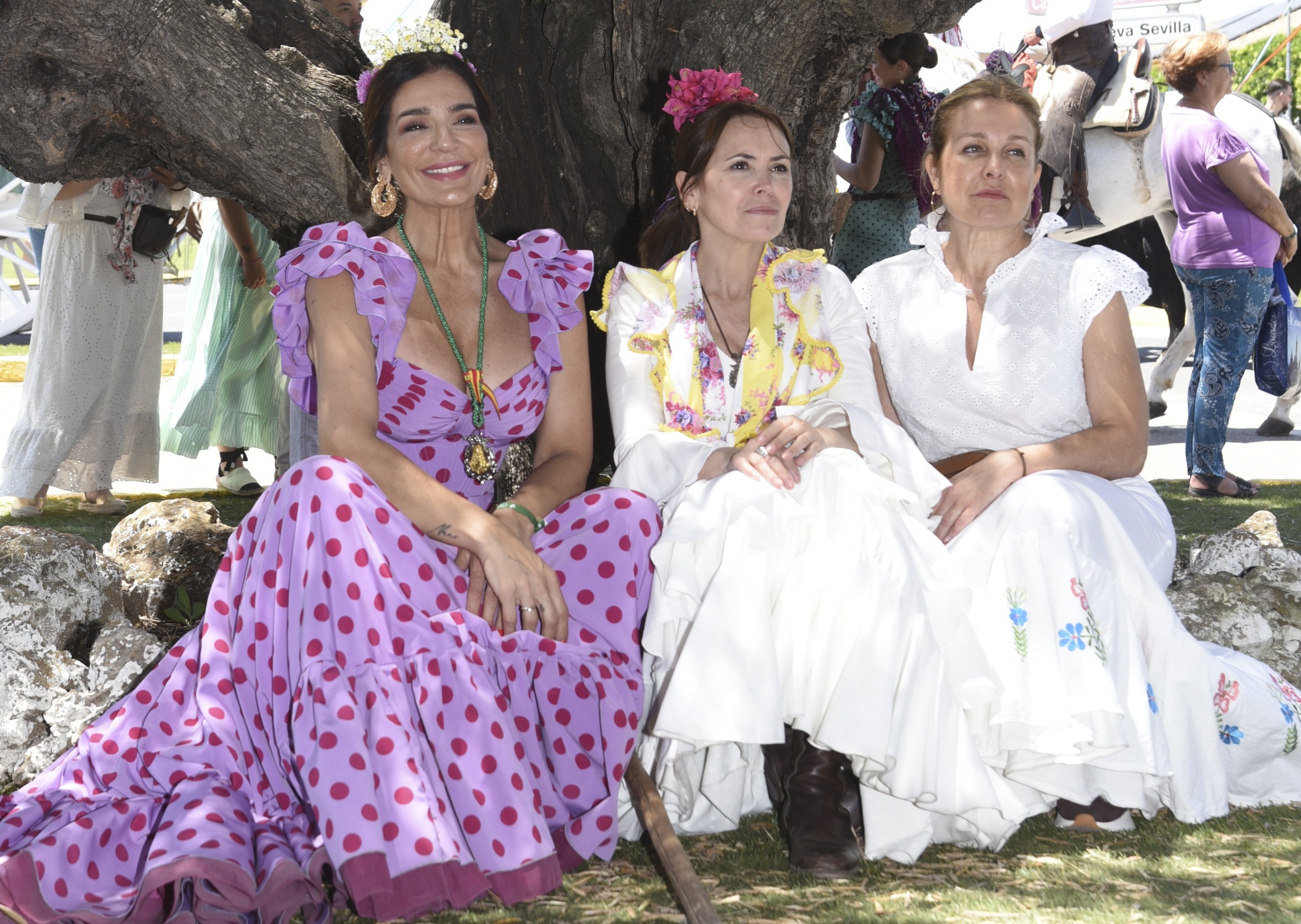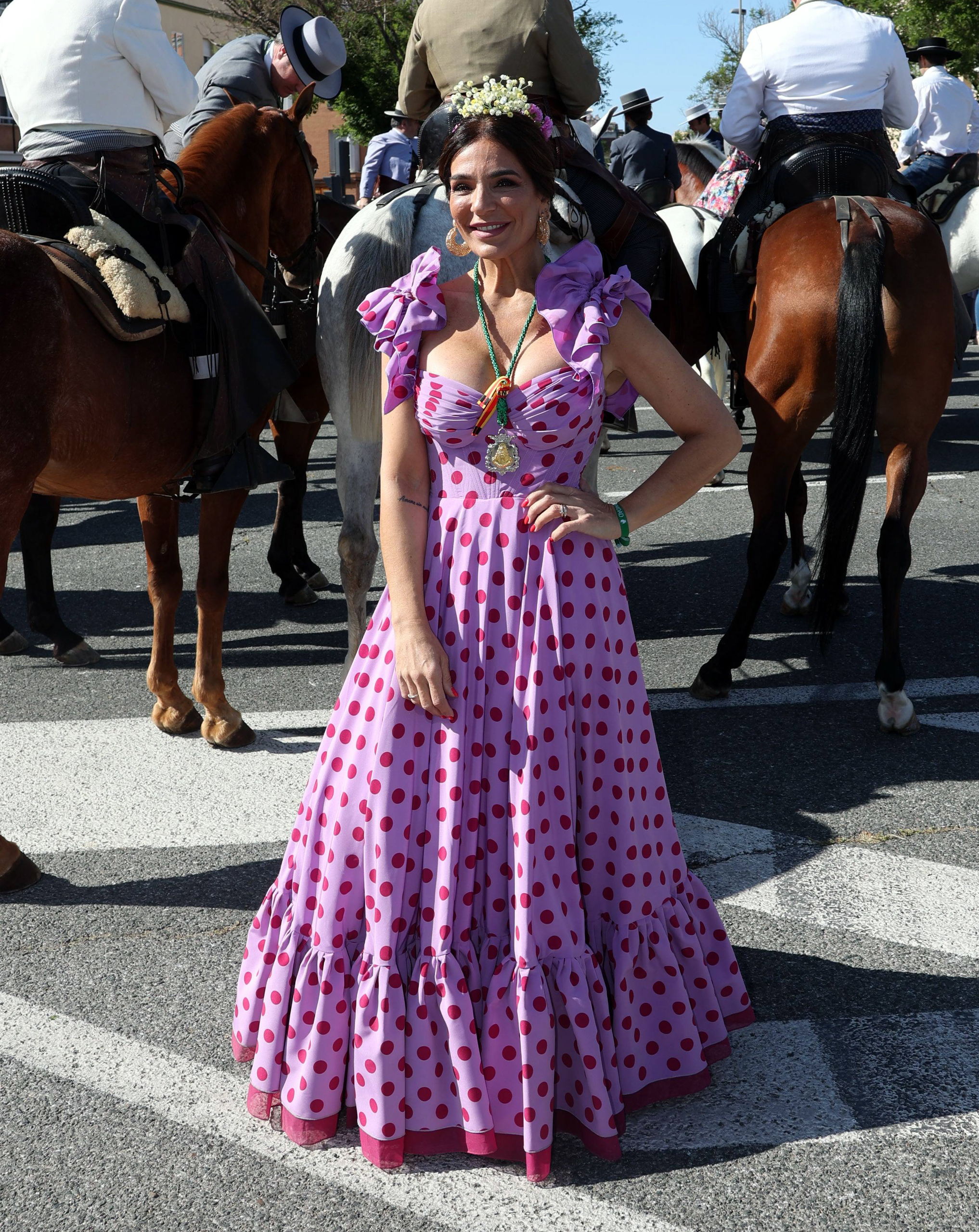 Fiel a la cita, un año más la diseñadora acudió a El Rocío junto a unas amigas para vivir el arranque del peregrinaje. Lució uno de su diseños flamencos, en esta ocasión con un estampado de lunares en rojo y morado.