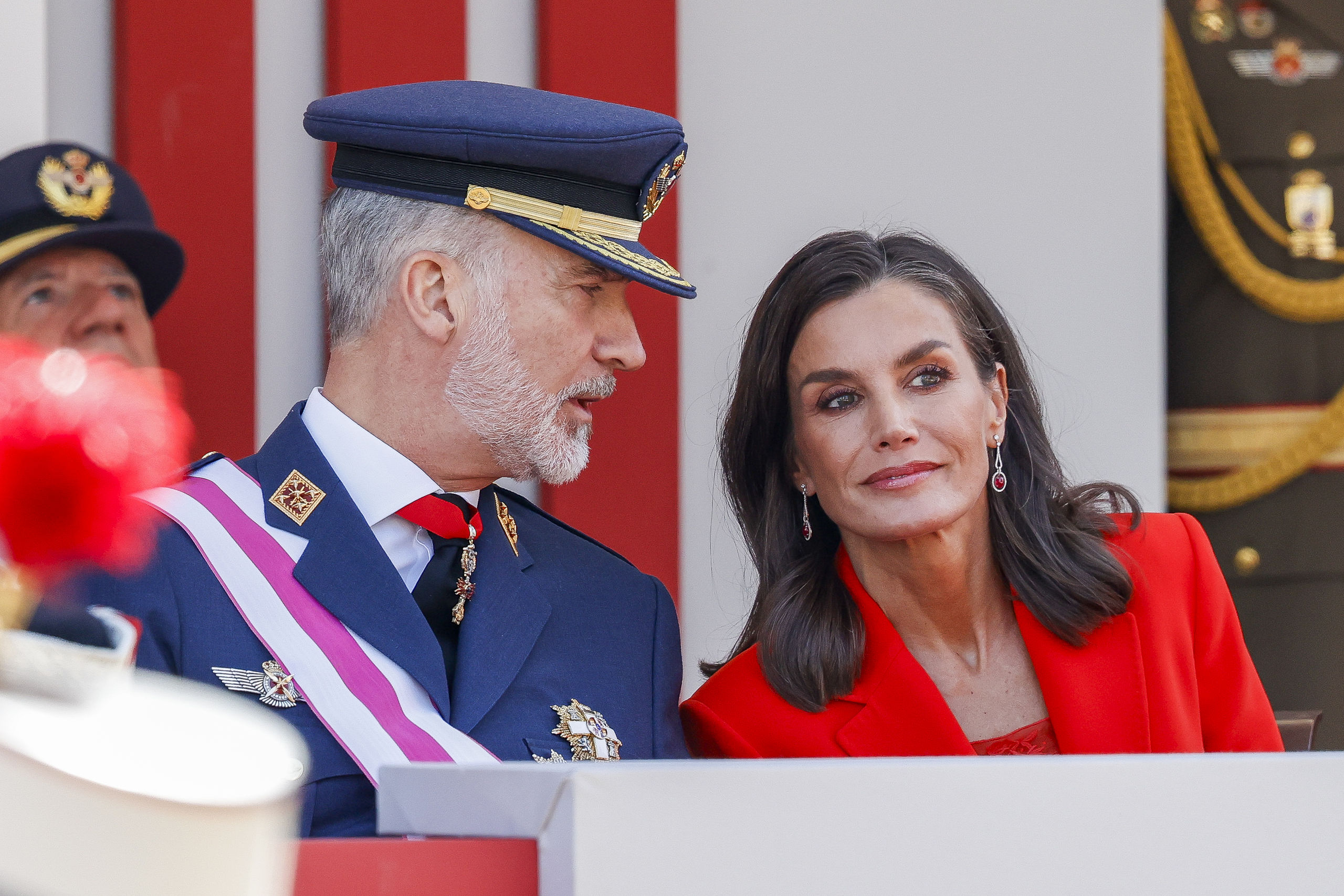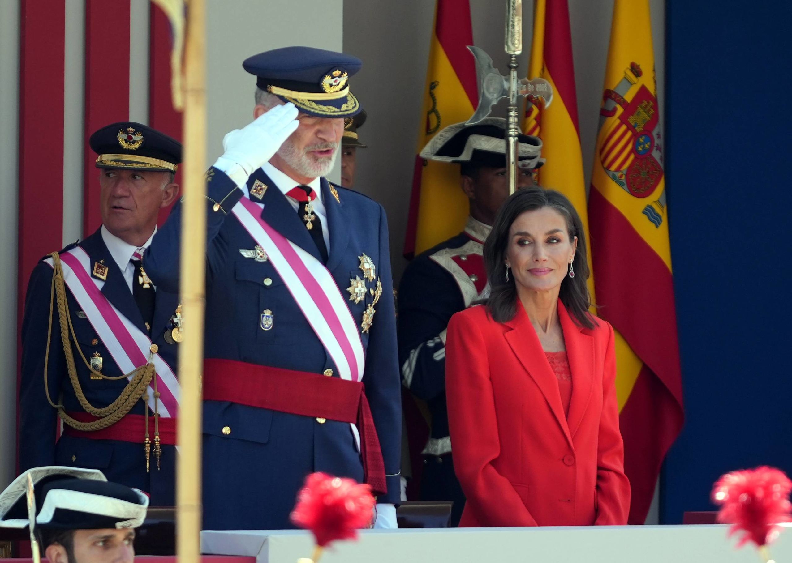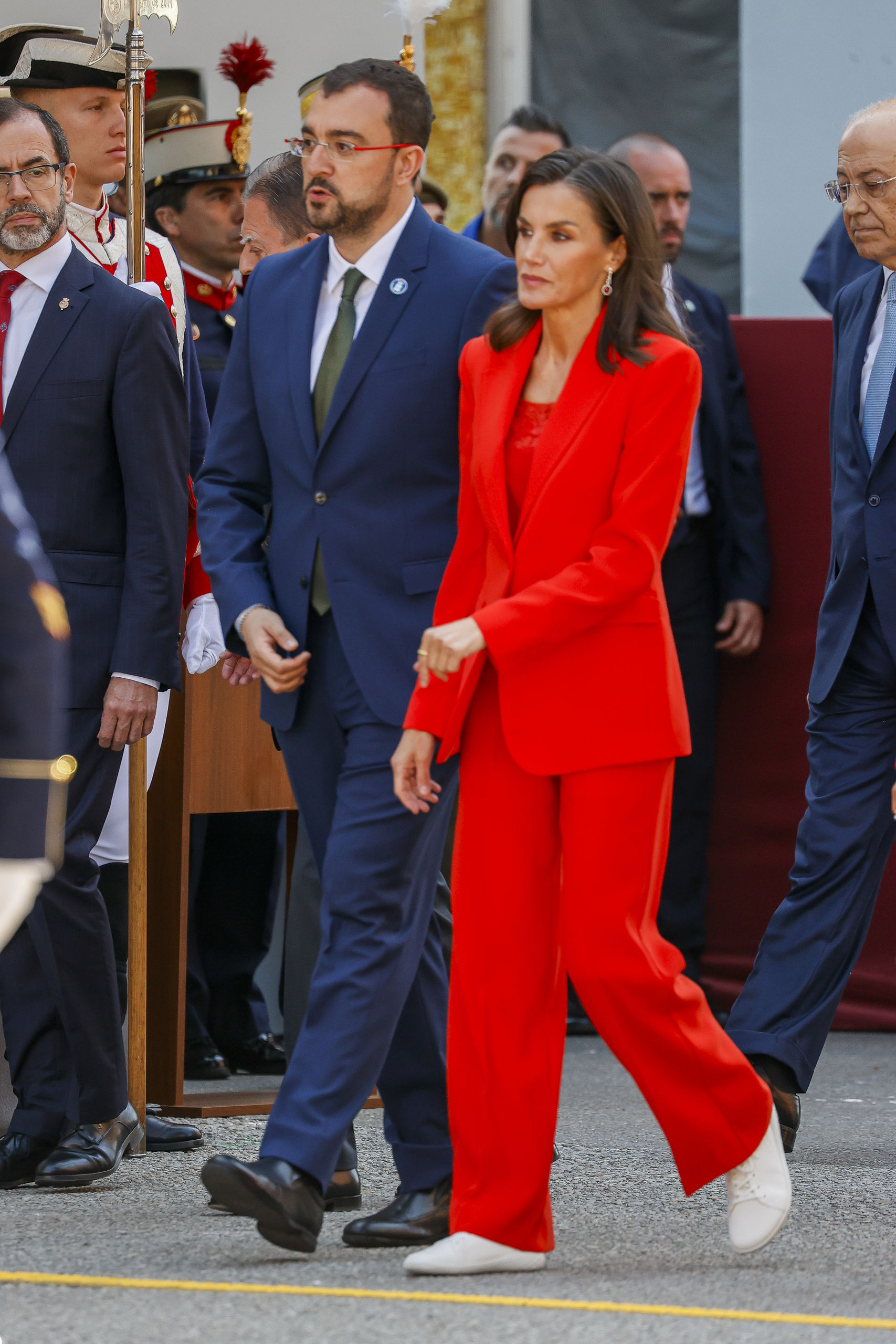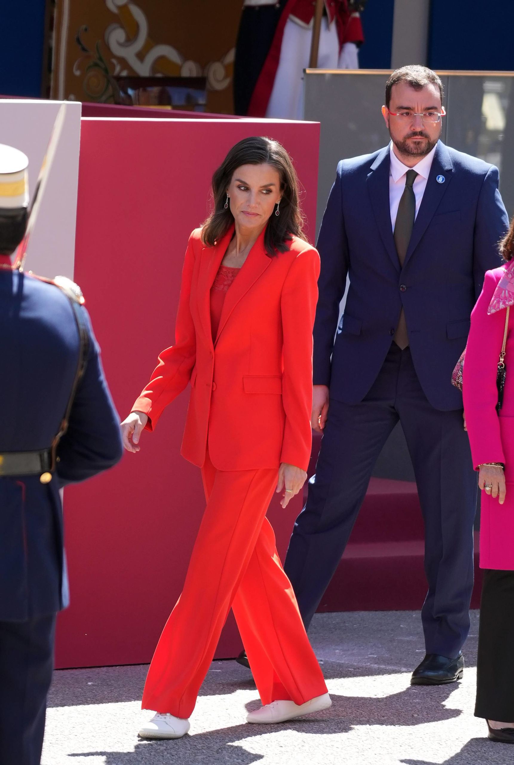 Traje rojo, top lencero y bambas: el look más cómodo de la reina Letizia en las Fuerzas Armadas