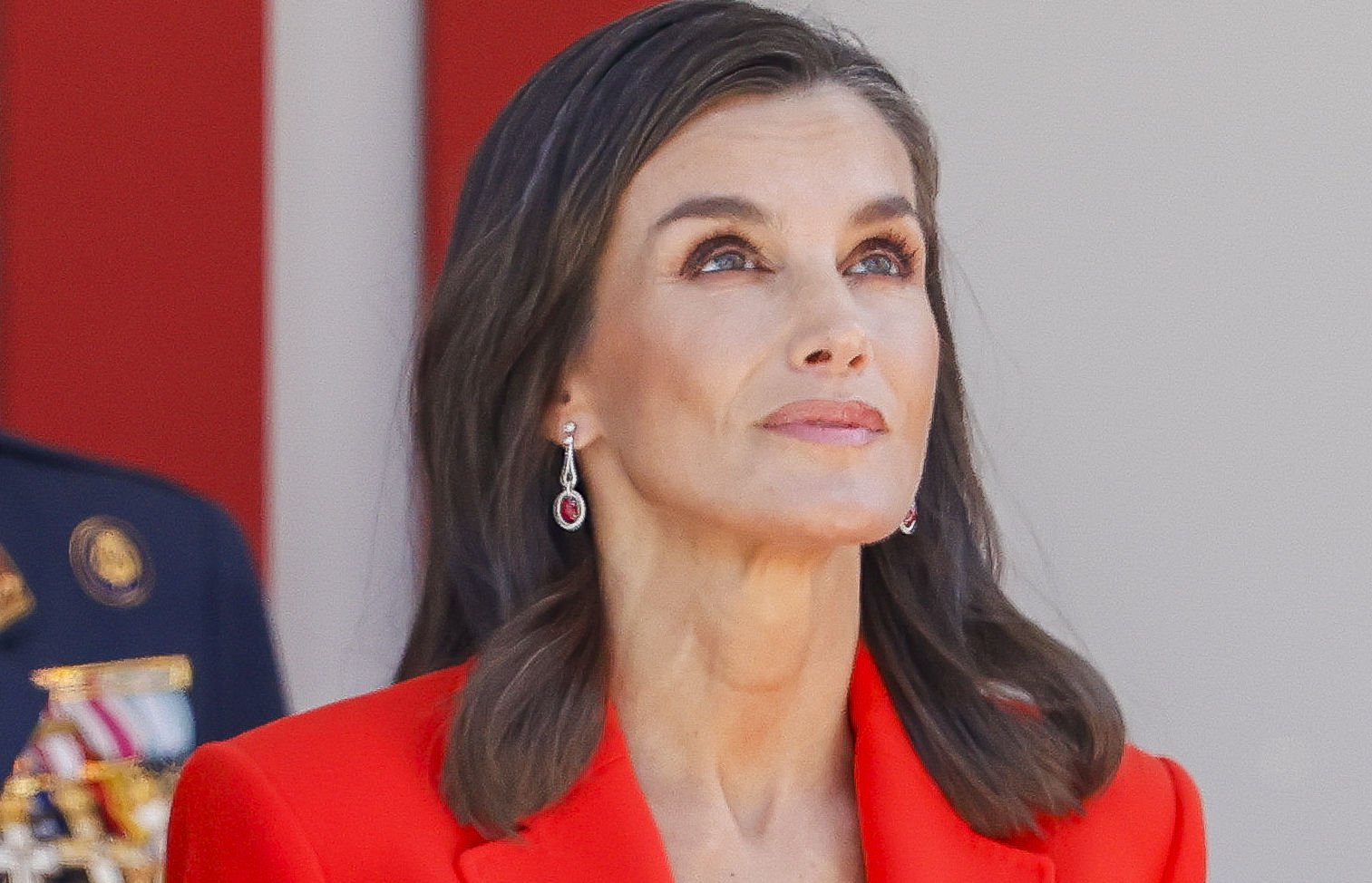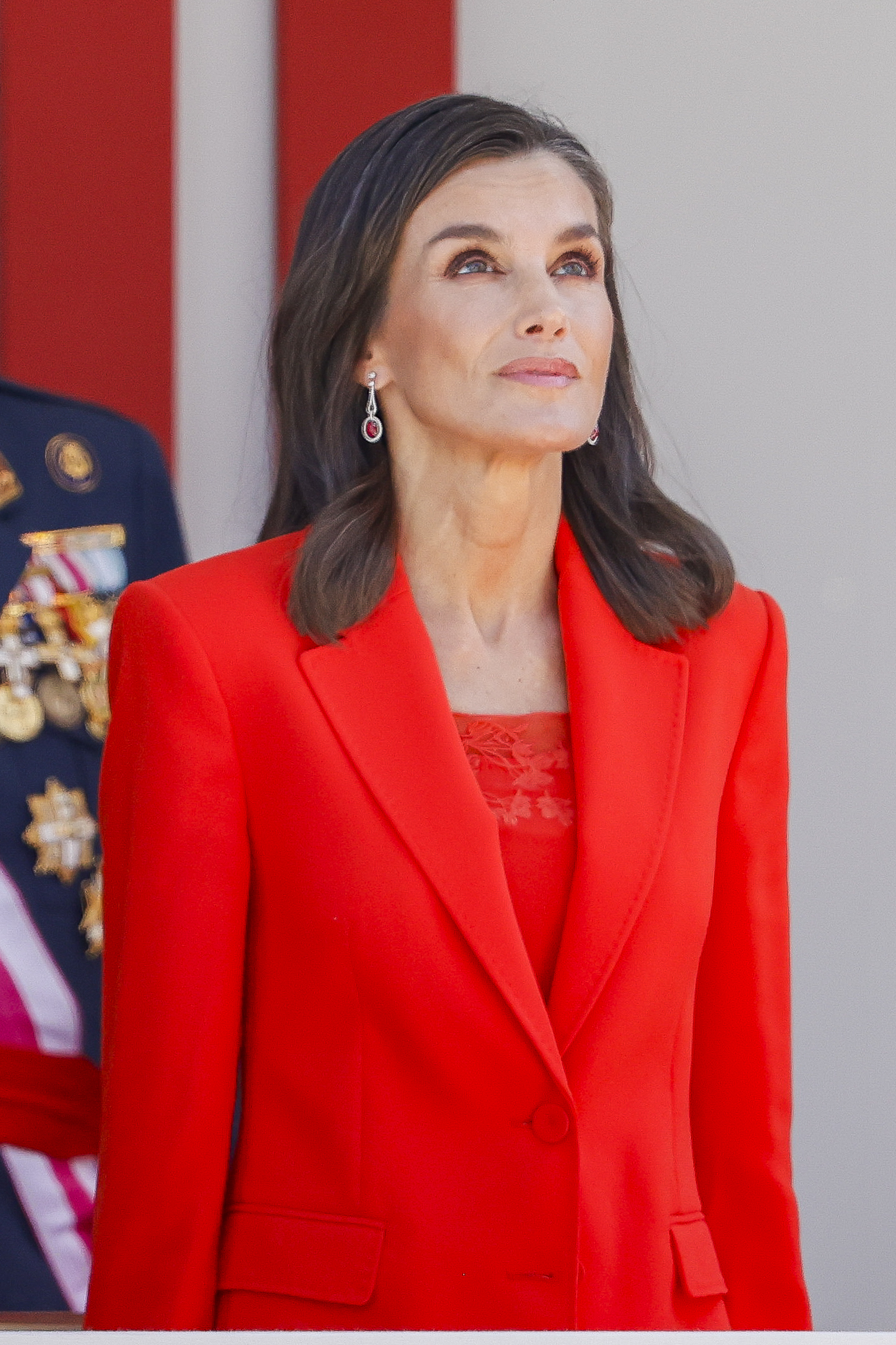 Ha completado el look con dos de sus joyas favoritas: el anillo de Coreterno y unos pendientes de oro blanco, diamantes y rubíes de la joyería Aldao Madrid. No es la primera vez que los lleva en esta celebración, ya que se los vimos en el día de las Fuerzas Armadas de 2019 en Sevilla.