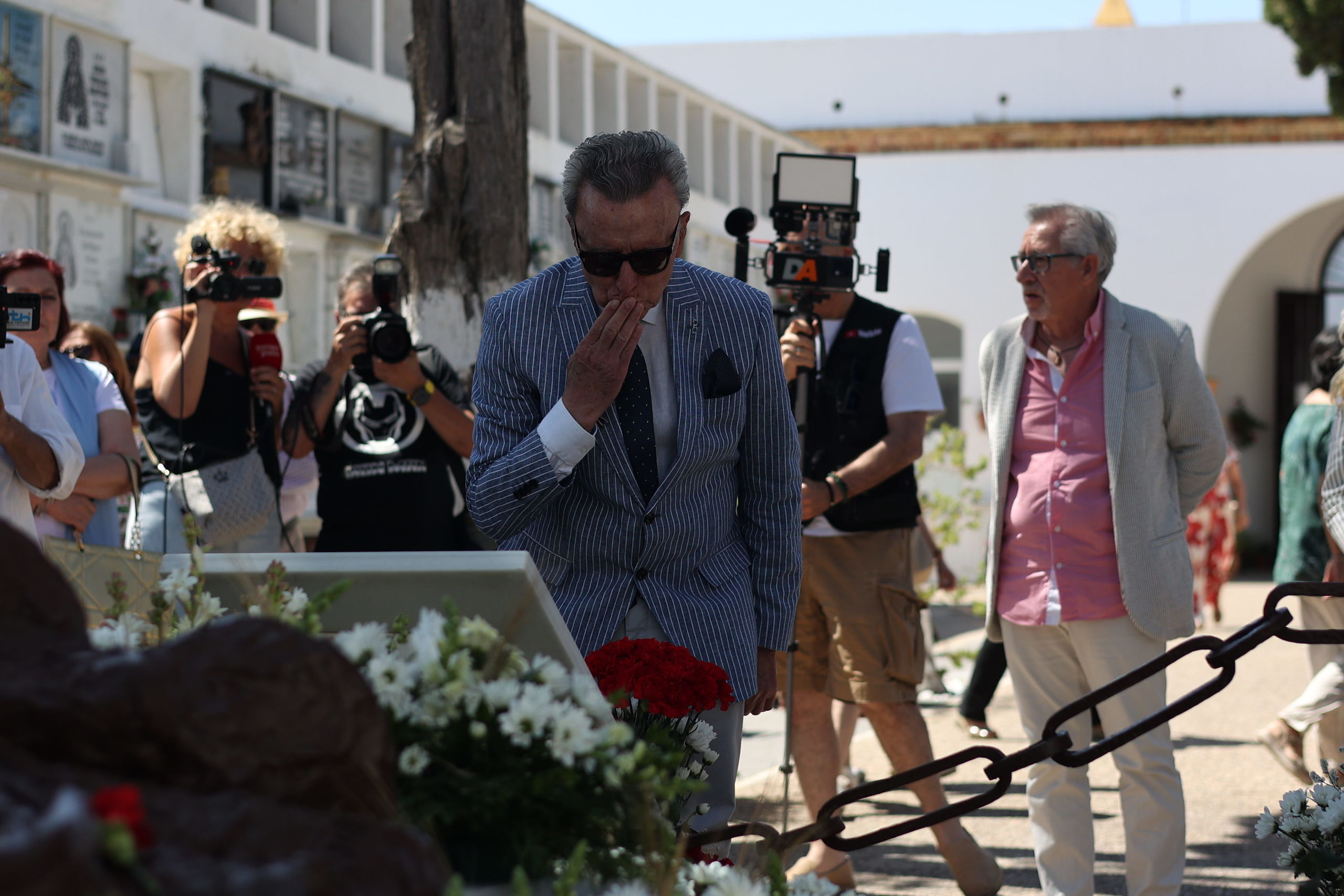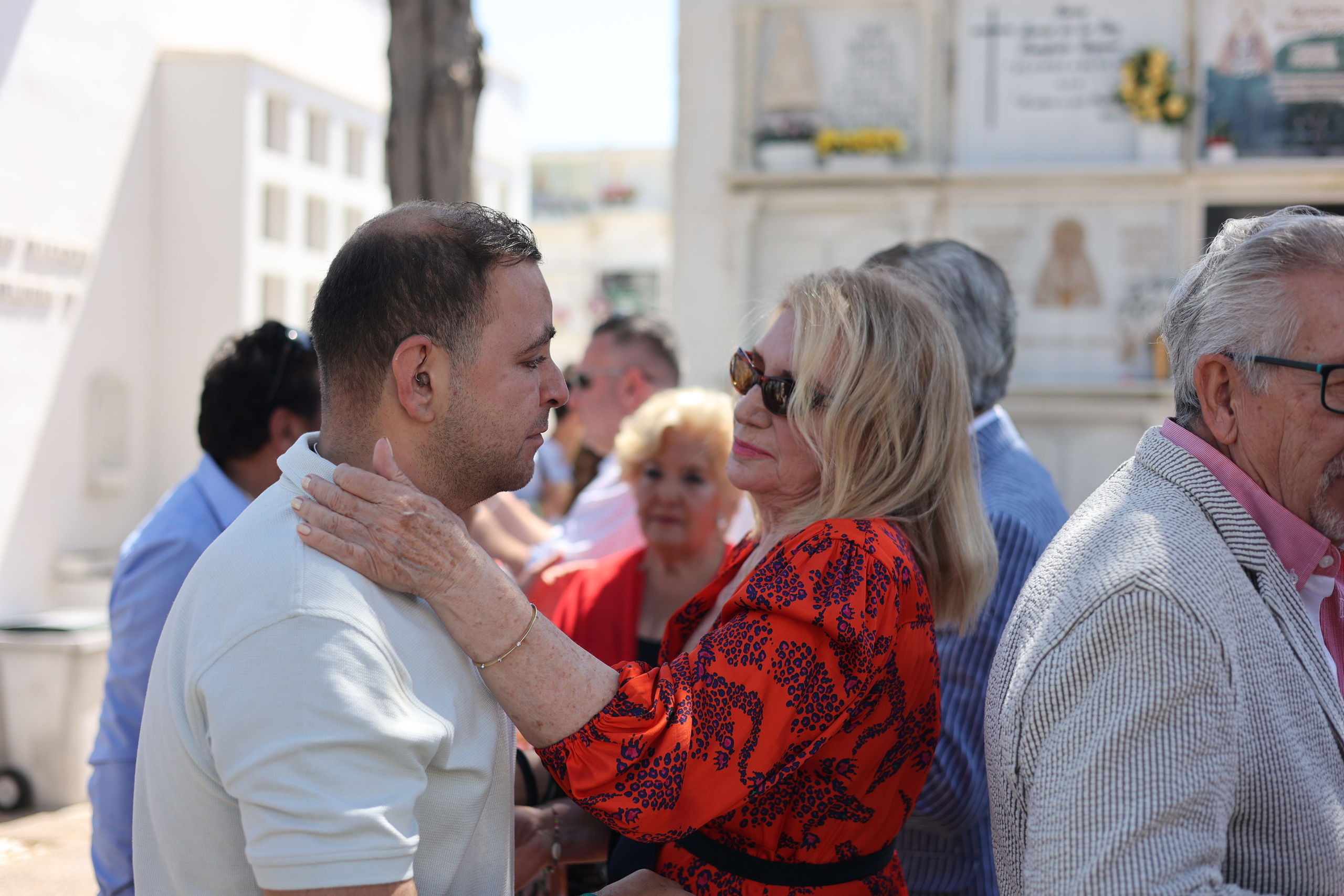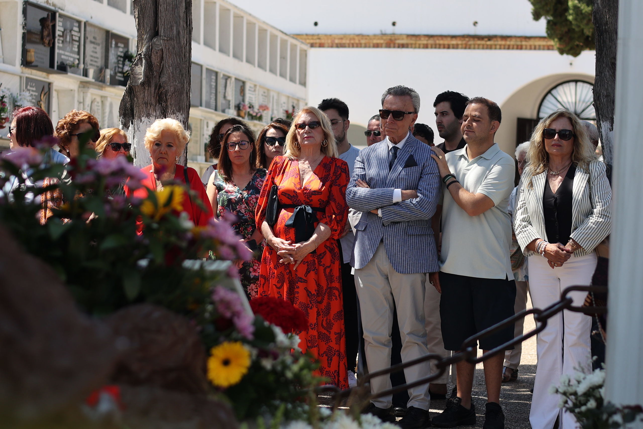 Tras la misa, todos ellos se desplazaban hasta el cementerio de Chipiona donde se encuentran los restos mortales de Rocío Jurado, en su conocido mausoleo, y allí la homenajeaban como cada año. En la foto, David Flores emocionado mientras Gloria Mohedano lo consuela.
