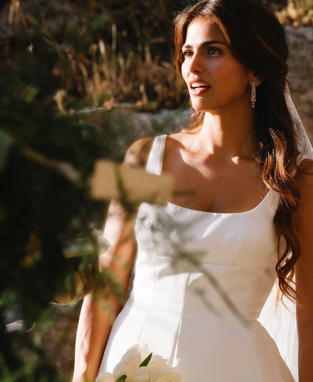 Sara, guapísima, brilló con luz propia en la ceremonia civil con un vestido de corte clásico de la famosa firma de novias. Un diseño blanco con escote redondo con tirantes finos, cuerpo ajustado con costuras marcadas en la zona del abdomen y falda voluminosa con cola, que combinó con un velo de tul prendido sobre su melena semirecogida con ondas, y un sencillo ramo de tulipanes blancos. Un look nupcial de diez que la actriz cambió por uno más moderno y cómodo durante la celebración.
