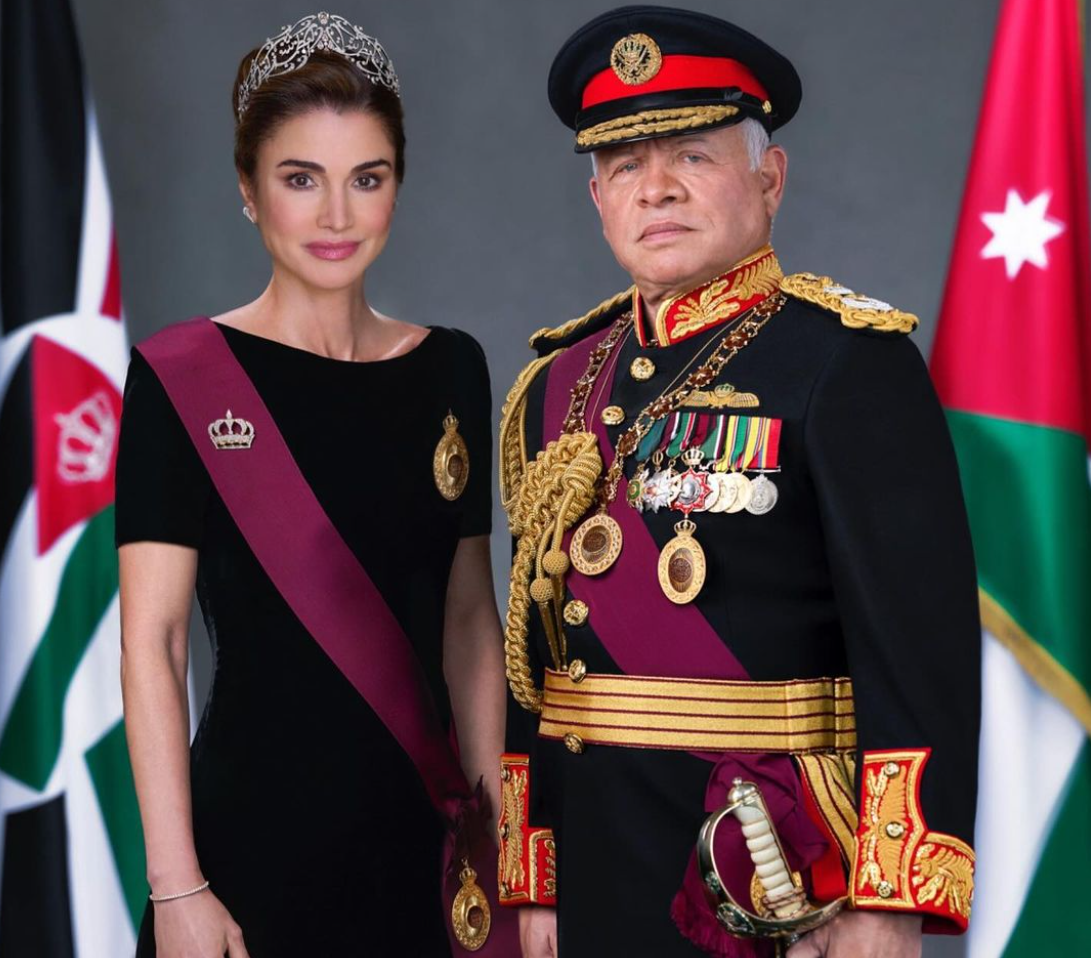 La pareja posa de pie, vestida de gala junto al estandarte real y la bandera de Jordania. En el caso de Abdalá II va vestido con el uniforme militar, incluyendo la faja, sable y las condecoraciones, entre la que destaca el collar de la Orden de Ali-Hussein bin Ali, la más alta de Jordania. Por su parte, la reina Rania luce un vestido negro recto de manga corta y escote barco, broche de corona de oro y diamantes con cinco arcos y cuatro rubíes en la base, y la Orden de Al-Hussein bin Ali. Con el pelo recogido, destaca la tiara, encargada por el propio monarca a la joyería Fred en 2005, con forma ligeramente triangular con unos 1.300 diamantes, siete piedras colgantes y rematada con un gran diamante en forma de pera de 20 quilates. Escrito en árabe, puede leerse, "Grandeza para Alá". La tiara la estrenó en 2006 durante un banquete de estado en el viaje oficial a los Países Bajos.