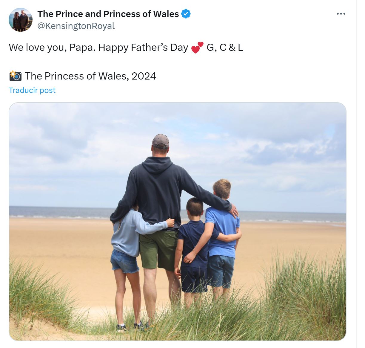 Hoy, 16 de junio, se celebra el día del Padre en Reino Unido y los príncipes de Gales han compartido una tierna imagen a través de sus redes sociales donde podemos ver al príncipe Guillermu junto con sus tres hijos. El píncipe George, la princesa Charlotte y el príncipe Louis salen de espaldas junto a su padre. Una imagen que han difundido en sus perfiles en redes sociales y que viene firmada por la princesa de Gales.