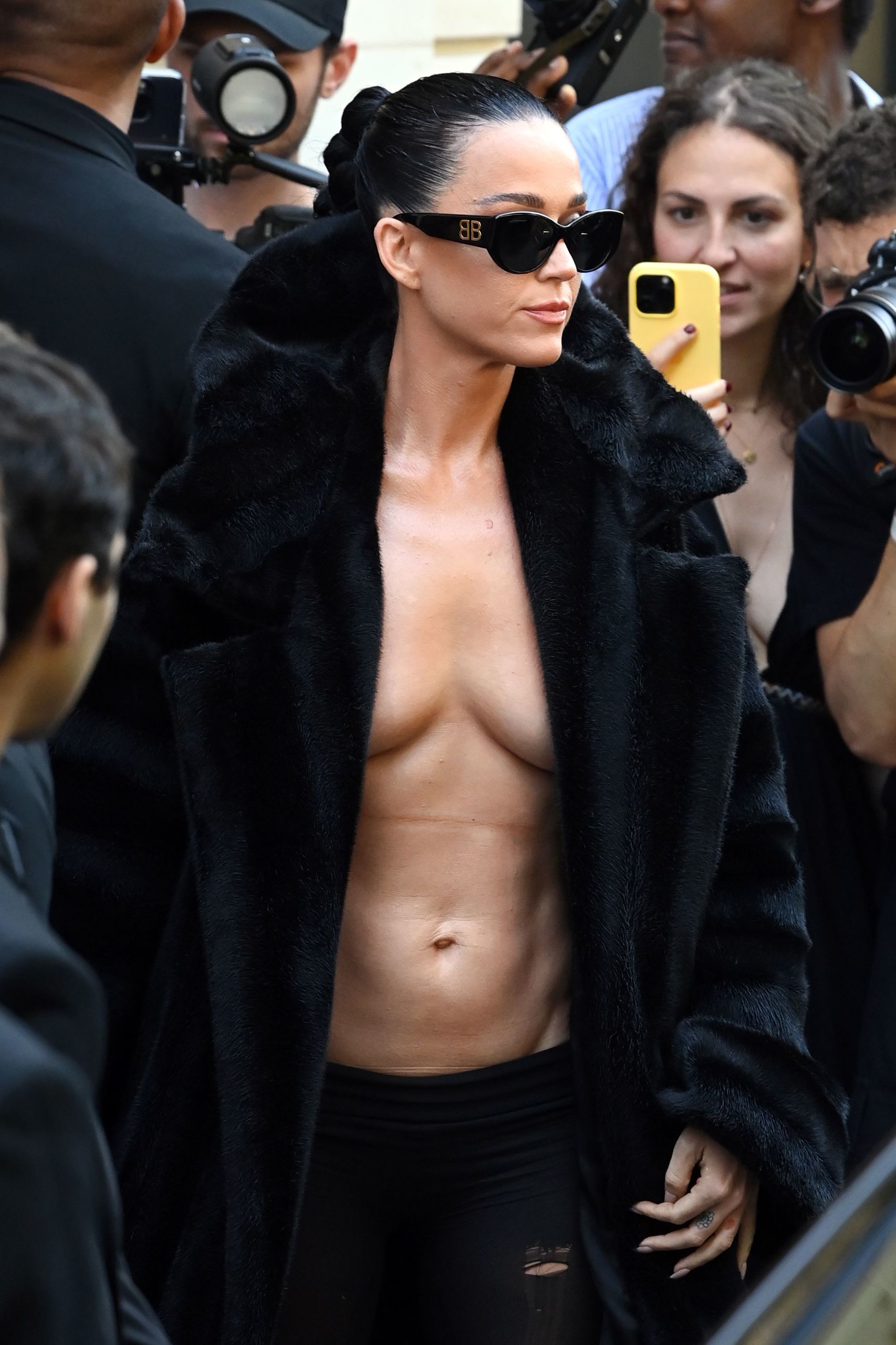 Katy Perry causó sensación en el desfile de Balenciaga con un look formado por unas mallas negras rotas y botas de tacón de aguja que acompañó con un enorme abrigo negro de pelo que mostraba su escote junto a unas gafas del mismo color.