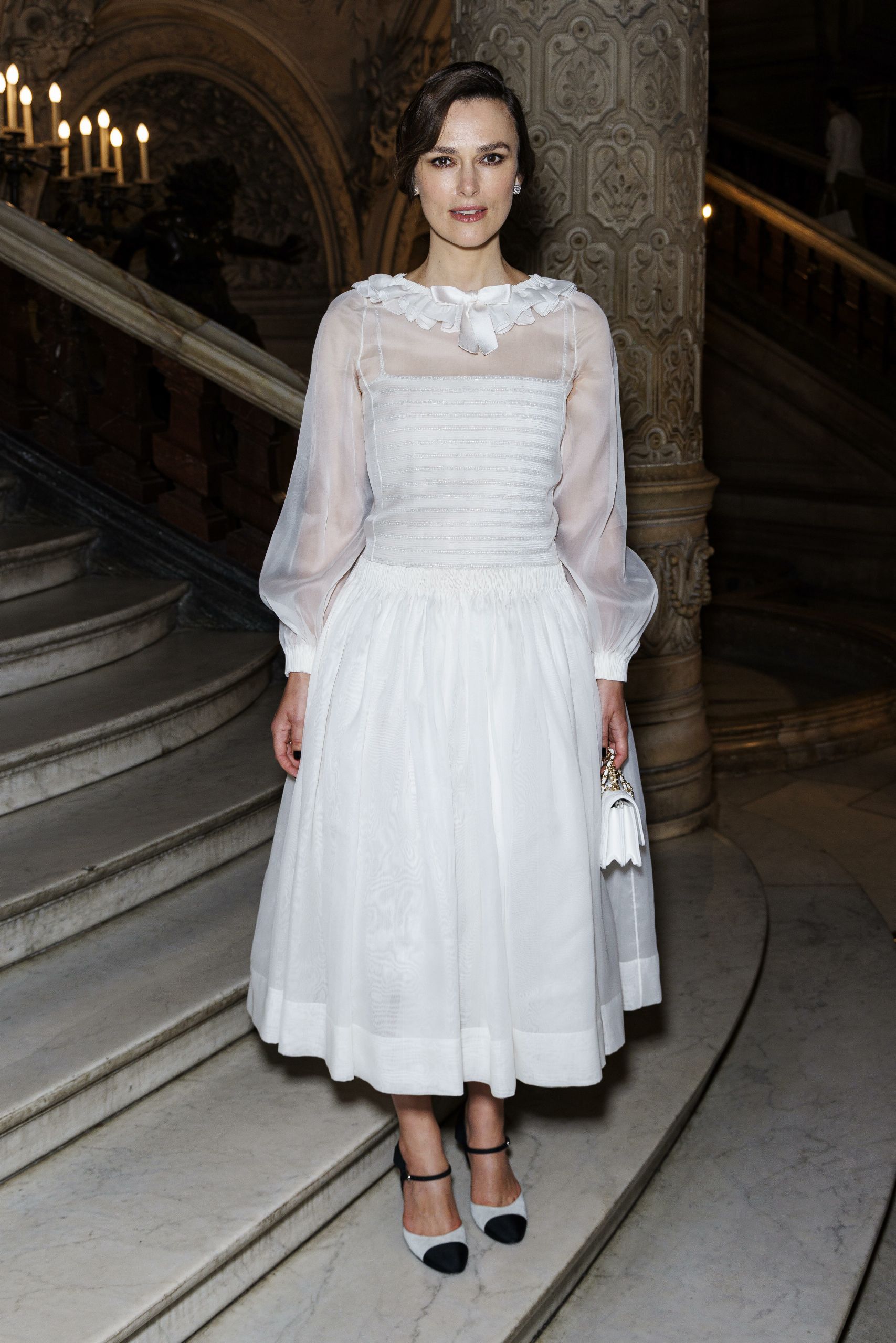 La actriz Keyra Knightley con un romántico vestido de Chanel de estética nupcial en blanco, con cuerpo transparente y falda acampanada. Lo combinó con salones bicolor y bolso pequeño acolchado.