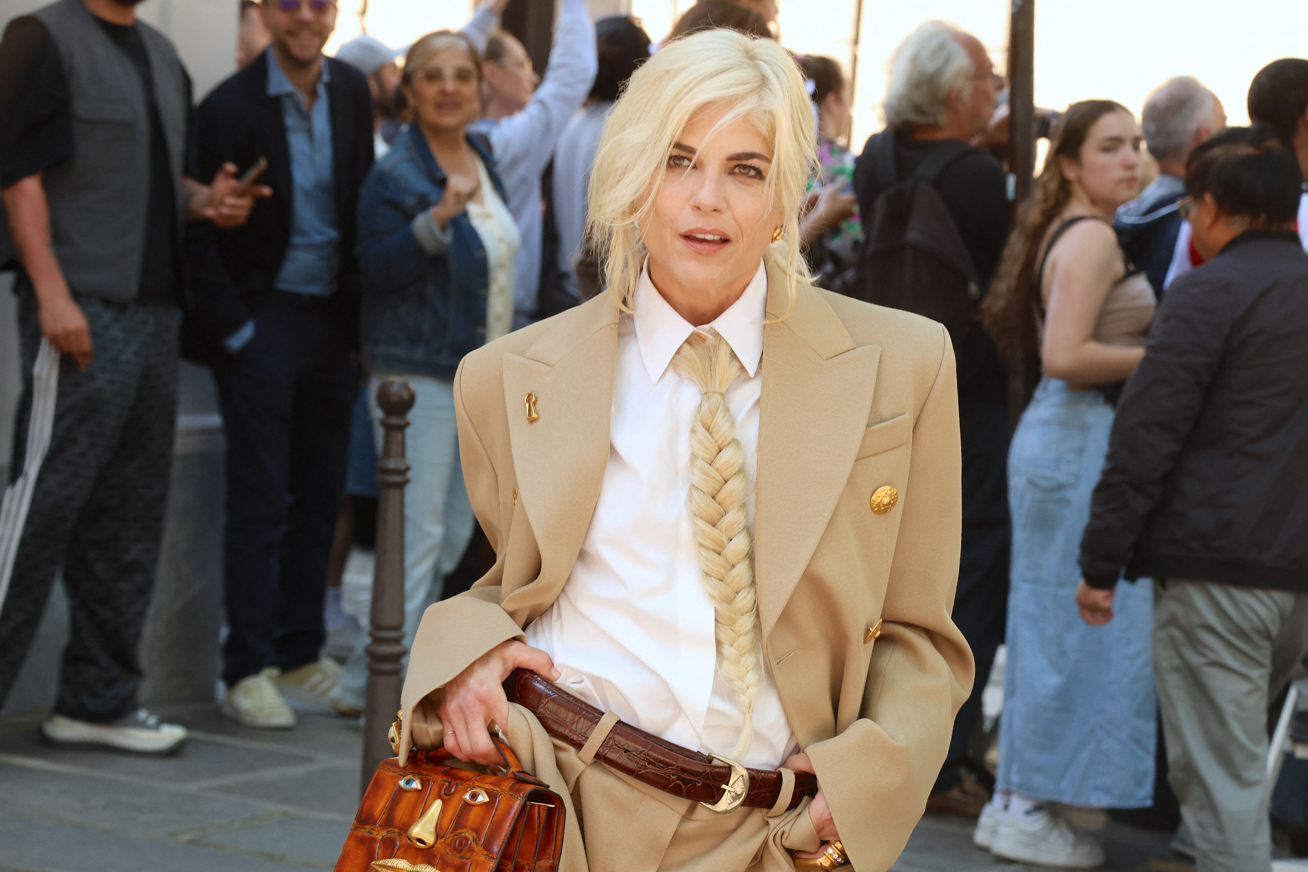 La actriz Selma Balir con un look de Schiaparelli con un traje oversize en tono arena y una perfecta trenza de cabello del mismo tono platinado que Blair.
