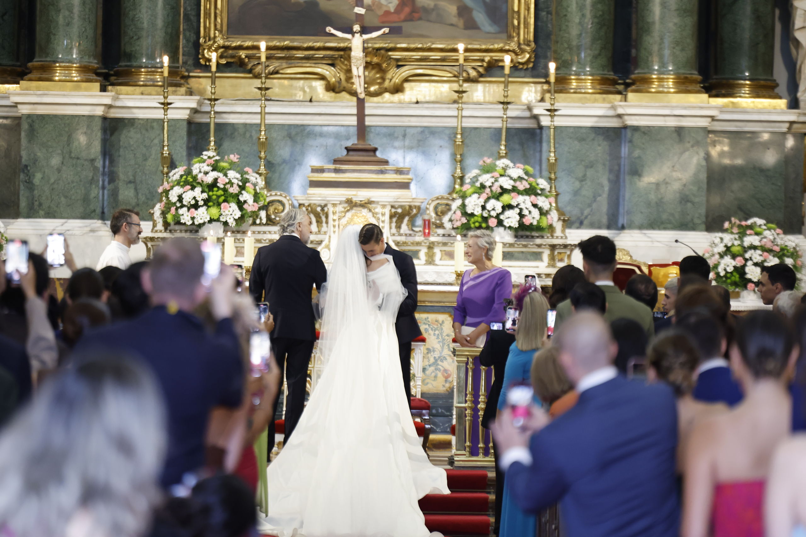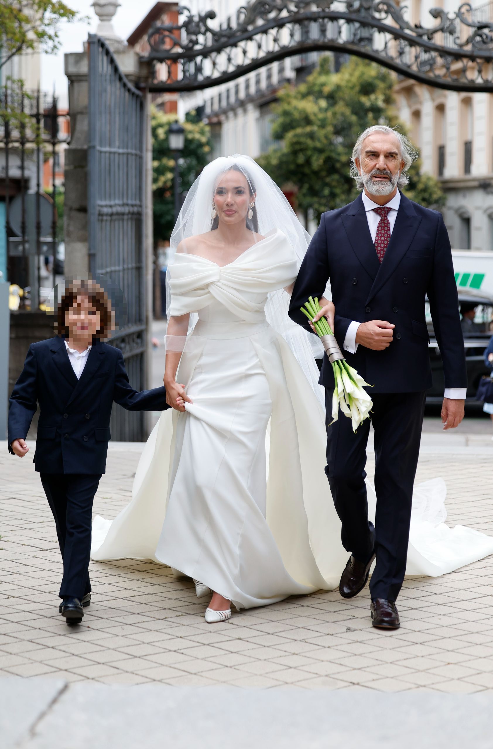 Como ya se sabía desde hacía días, el vestido firmado por Vicky Martín Berrocal, perteneciente a su firma Victoria Colección, está compuesto por un elegante escote Bardot anudado, una falta recta y una larga cola. Completaba su traje nupcial con unos zapatos de tacón a tono, un velo de tul y unos pendientes perlados de grandes dimensiones. En la foto, junto a su padre y su hijo Mateo, que ha acompañado a su madre hasta el altar.