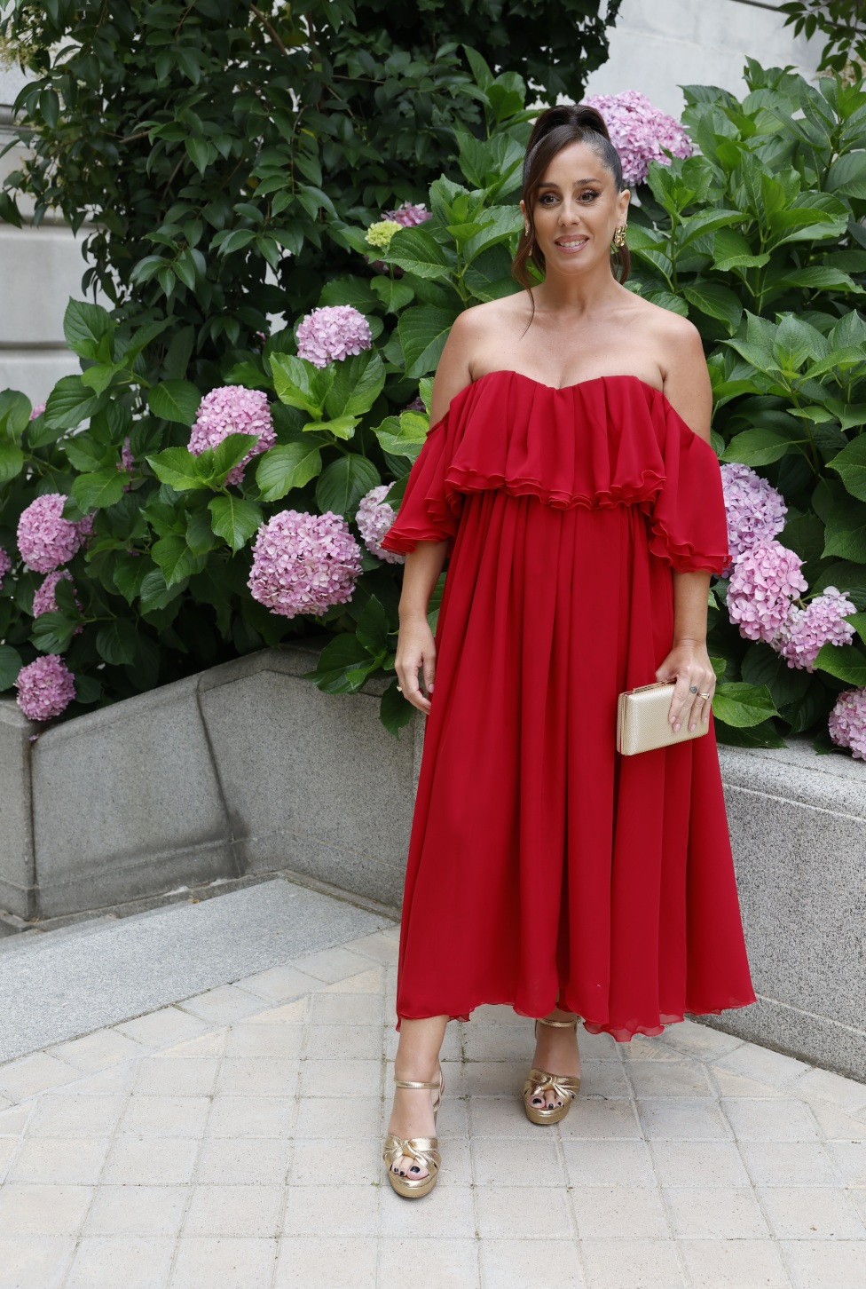 Tampoco ha querido perderse el evento la gran amiga de la novia, Anabel Pantoja quien ha optado por un vestido rojo con los hombros al descubierto y un volante en el escote. Como peinado, una coleta con ondas que la hacía parecerse aún más a su tía Isabel.