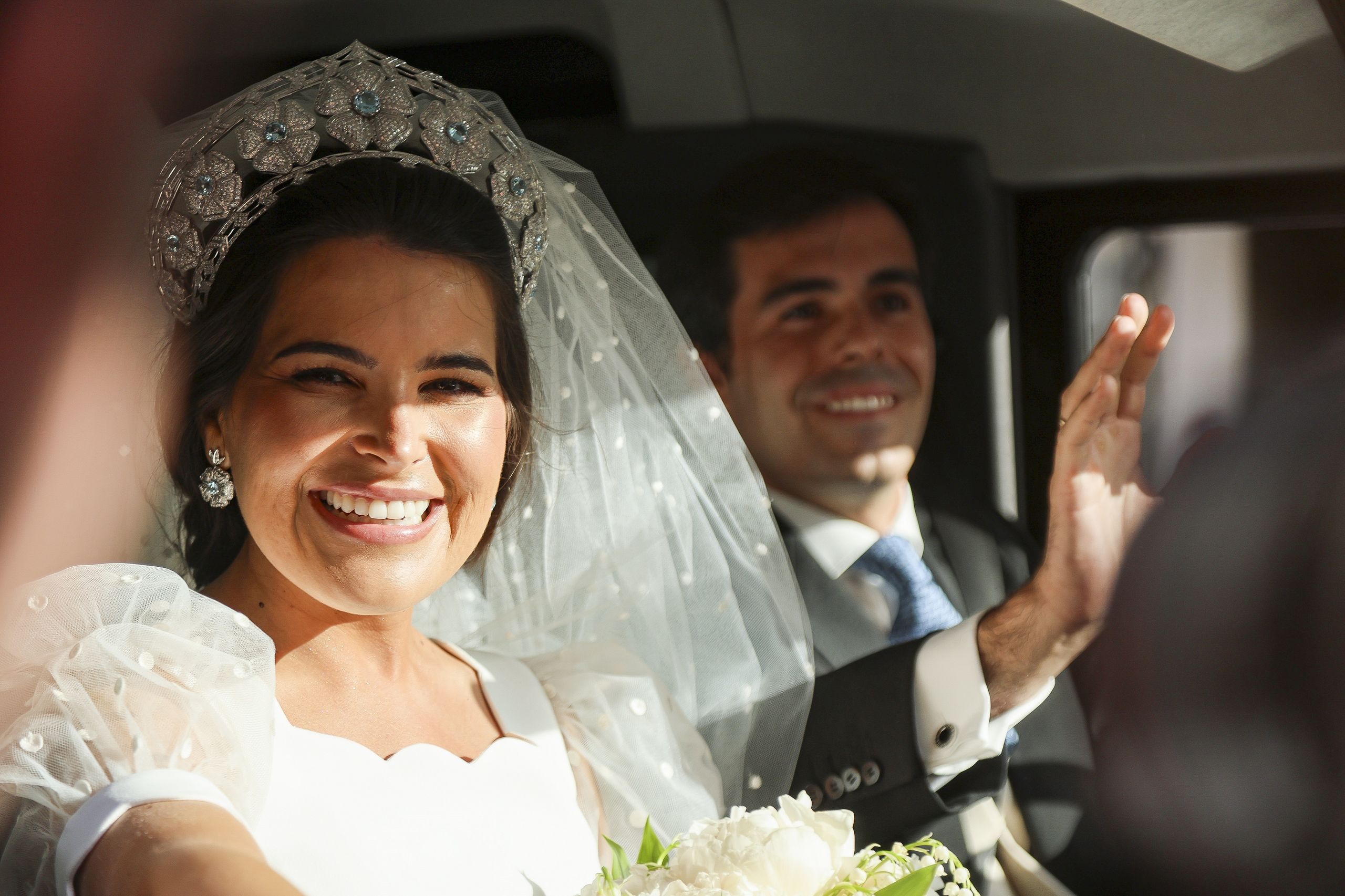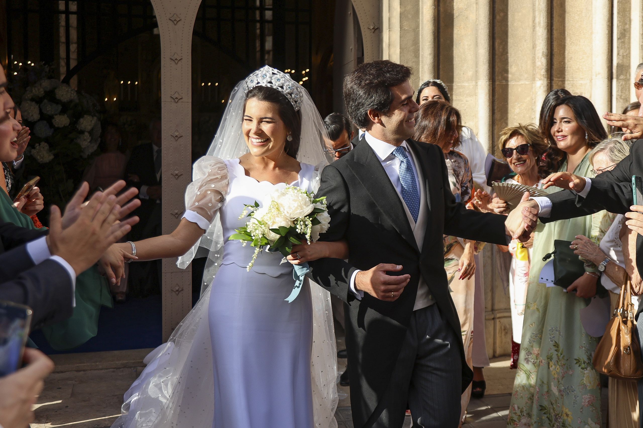 Los novios, ya convertidos en mario y mujer, a la salida de la iglesia. Natalia ha lucido un diseño de Navascués, de falda larga y fluida, manga corta abullonada en plumeti, que acompañaba con un largo velo. El toque final lo ha puesto una exquisita tiara llena de simbolismo e historia para la casa y la familia Yanes de la que prendia el velo.