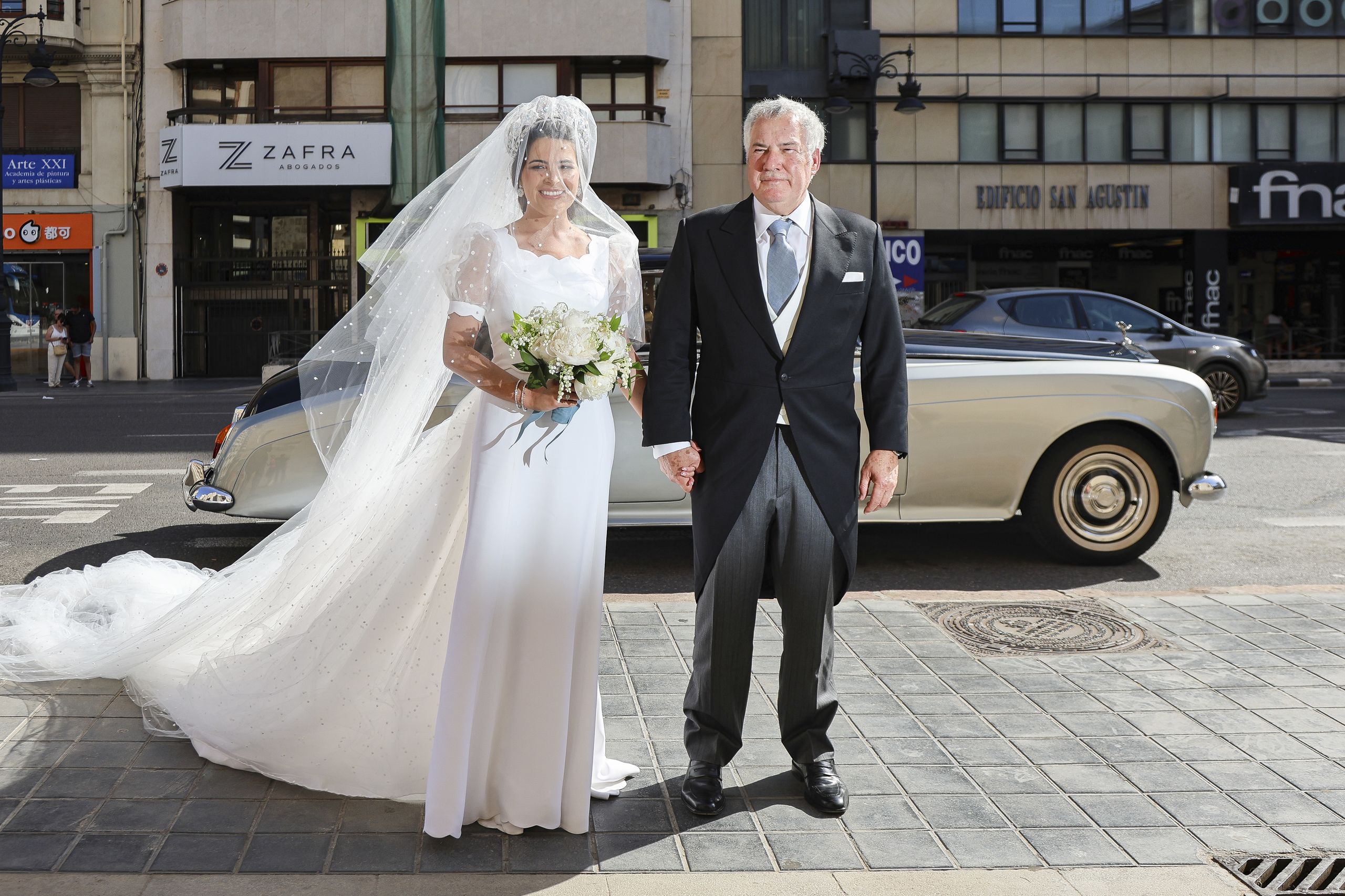 La novia llegó a la iglesia de Santa Catalina y San Agustín de Valencia, en un clásico coche deportivo gris y negro del brazo de su padre, José Luis Santos.