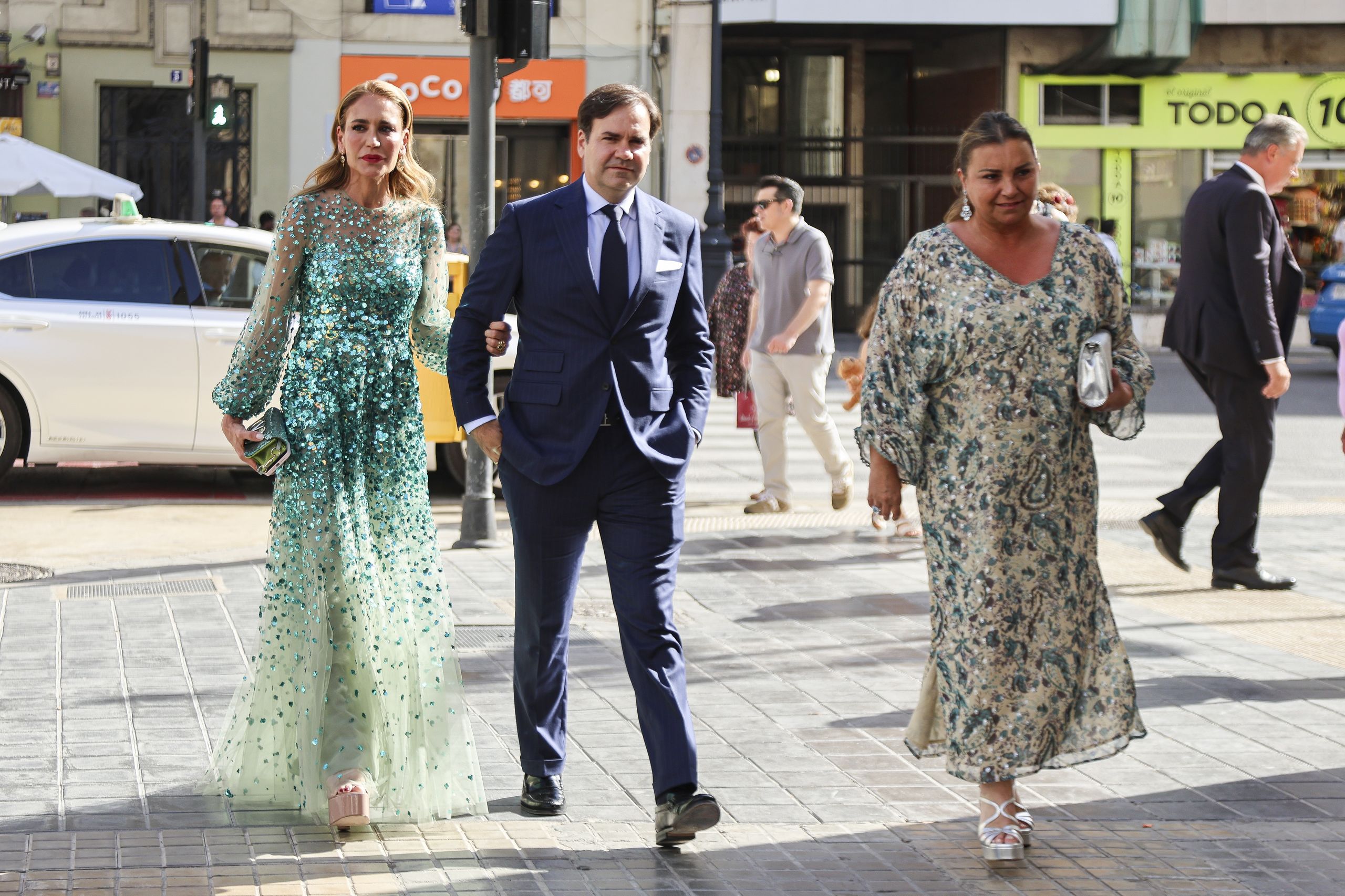 Gema Ruiz, acompañada de su marido Juan Díaz, a su llegada a la parroquia de Santa Catalina y San Agustñin de Valencia. Gema ha lucido un vestido largo de pailletes en tonos verdes