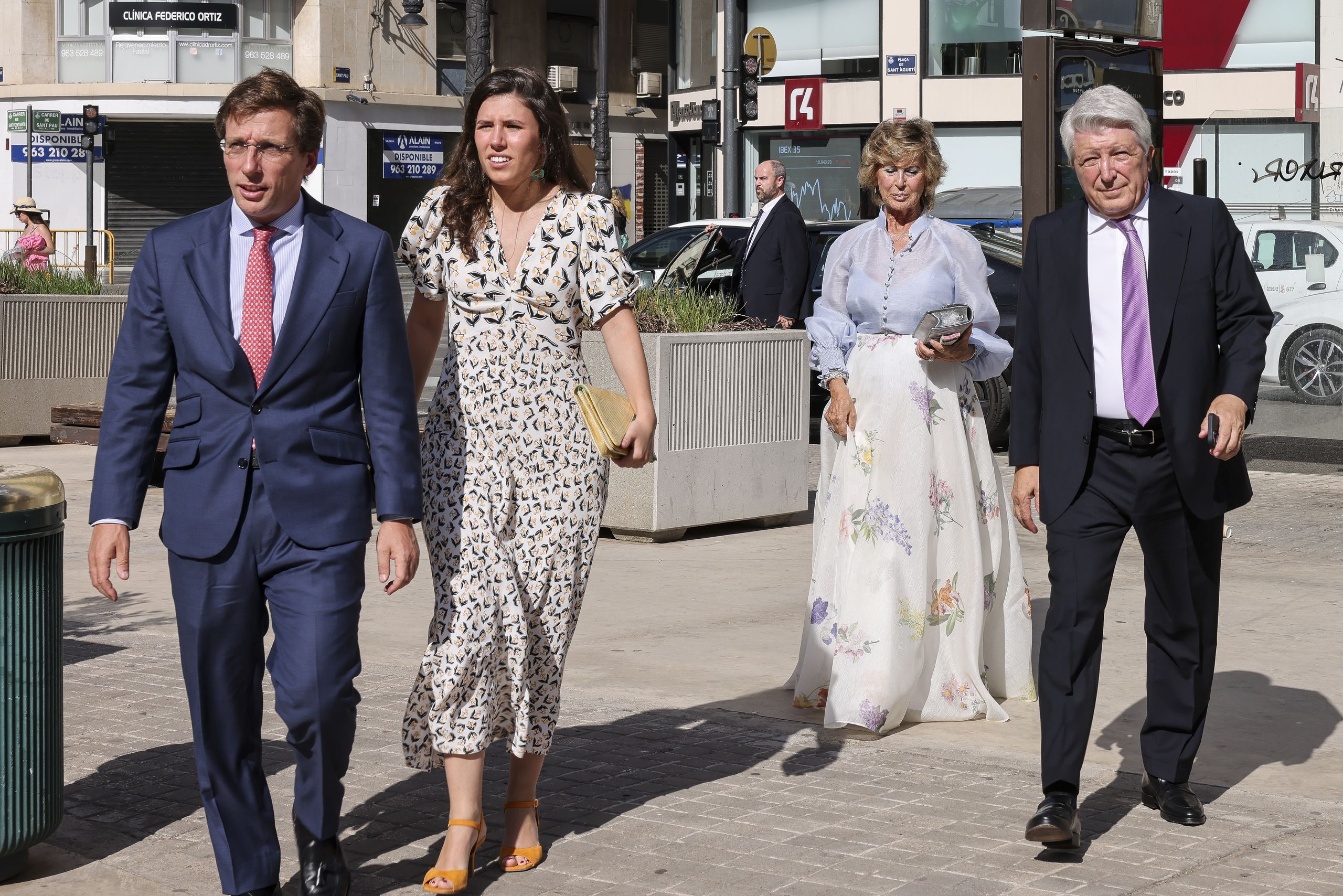 El alcalde de Madrid, José Luis Martínez-Almeida y su mujer, Teresa Urquijo, con un look informal que complementaba con sandalias amarillas, a su llegada a la ceremonia acompañado del presidente del Atlético de Madrid, Enrique Cerezo y su mujer