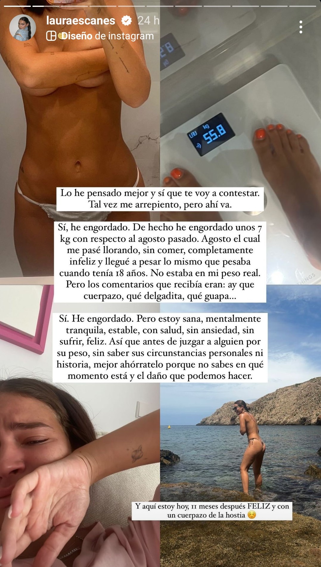 Laura Escanes ha protagonizado una dura pelea en Twitter después de contestar a un usuario en Instagram que le preguntó si había engordado. Aunque en un principio estaba dispuesta a ignorarle, minutos después publicó un texto con el que quería demostrar que el cambio de peso no le afecta. "Lo he pensado mejor y sí que voy a contestar. Sí, he engordado. De hecho he engordado unos siete kilos con respecto al agosto pasado. Agosto el cual me pasé llorando, sin comer, completamente infeliz y llegué a pesar lo mismo que pesaba cuando tenía 18 años. No estaba en mi peso real. Pero los comentarios que recibía eran ‘ay, qué cuerpazo, qué delgadita, qué guapa’....", comienza la publicación.