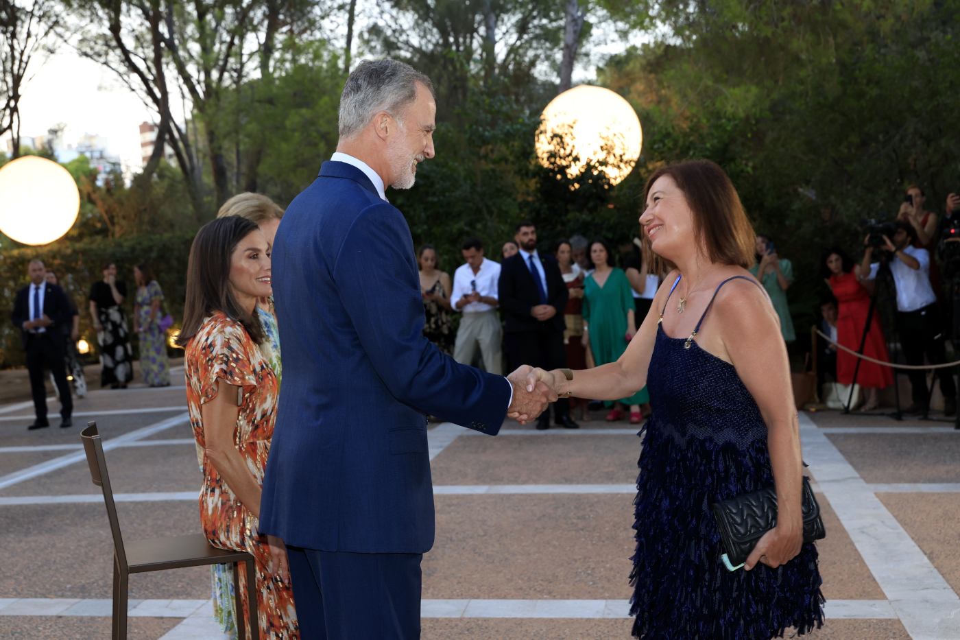 S.M. el Rey saludando a la presidenta argalida Prohens, que ha acudido con su marido, Javier Bonet. Le han precedido en el saludo, la presidenta del Congreso Francina Armengol y el presidente del Tribunal Constitucional, Cándido Conde-Pumpido