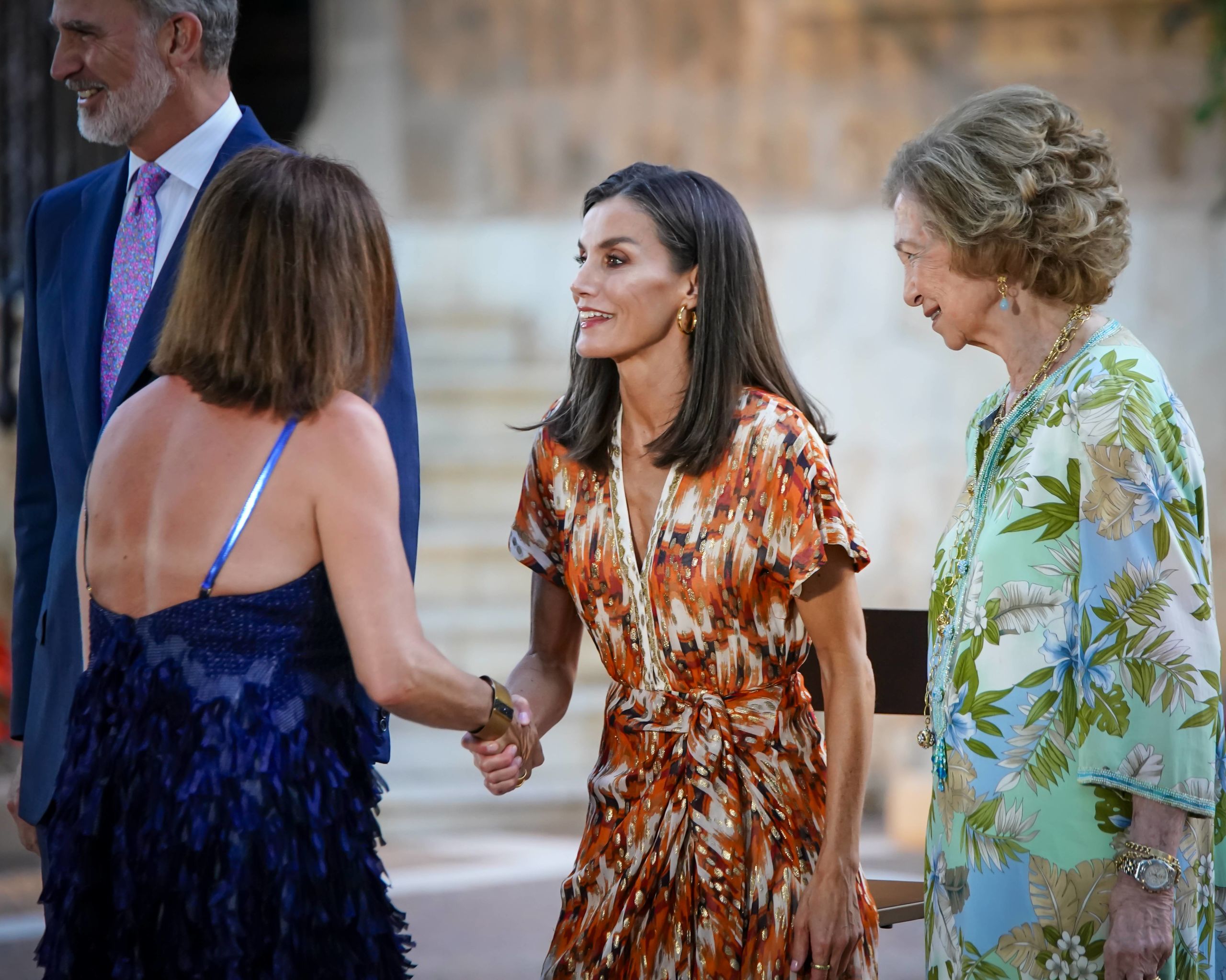 Por su parte, la reina Sofía, y fiel a su estilo, ha lucido un conjunto de camisola y pantalón con estampado vegetal en tonos verdes y ocres, combinadas con alpargatas de cuña plateadas. Este conjunto ya lo llevó, en su momento, en una recepción en La Almudaina en 2012. AL igual que el año pasado, llevó un conjunto de pendientes y collar de la diseñadora mallorquina Isabel Guarch, también presente en la recepción.