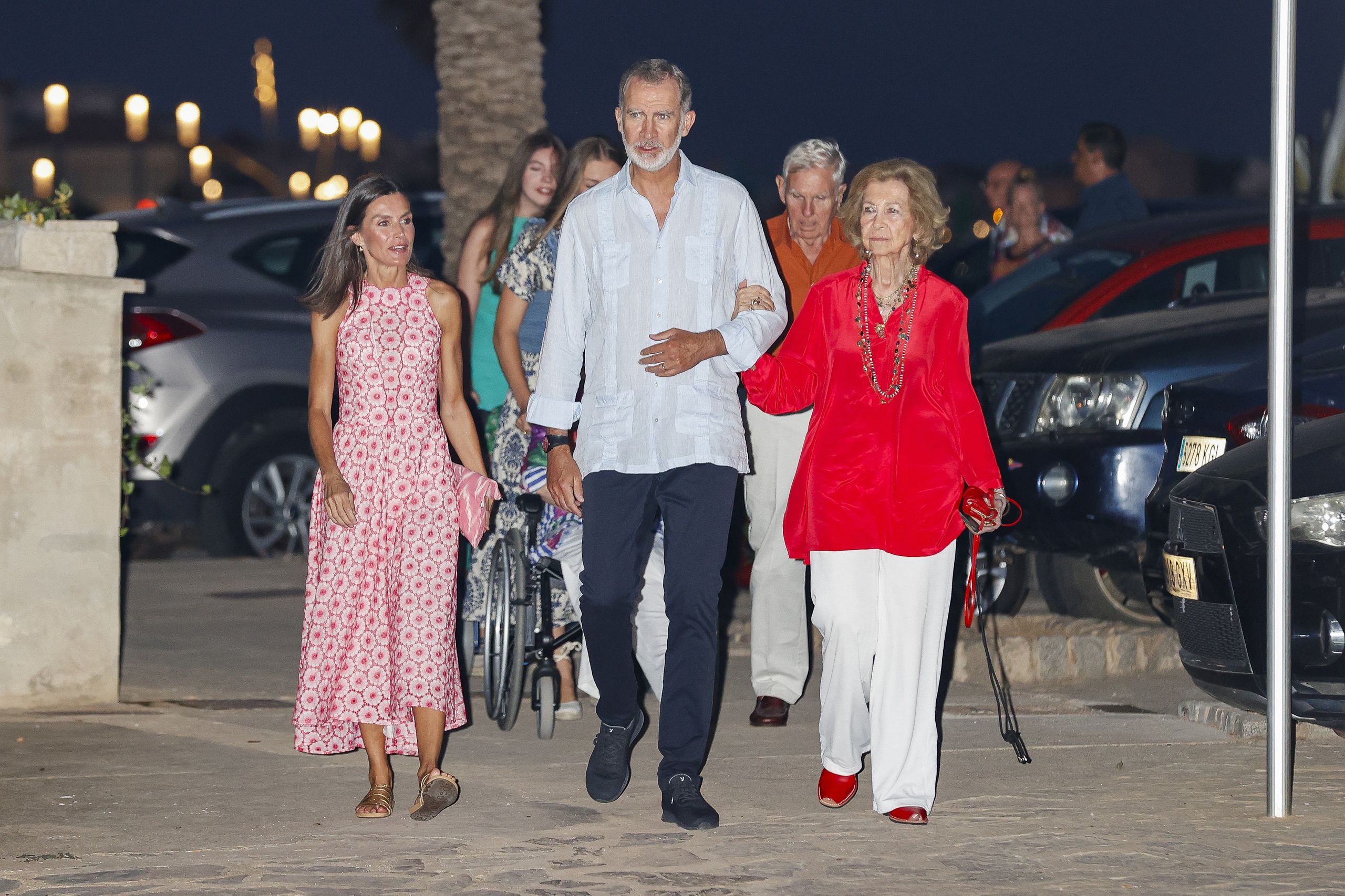 A los Reyes les acompañan Irene de Grecia, hermana de doña Sofía, y el matrimonio formado por el doctor Fruchaud y su mujer, Tatiana Radziwill, personas discretas y de la máxima confianza de la reina Sofía. Tanto Irene de Grecia como Tatiana Radziwill iban en silla de ruedas y han sido ayudadas por la princesa Leonor y su hermana Sofía, que han estado muy cercanas y cariñosas con ellas.