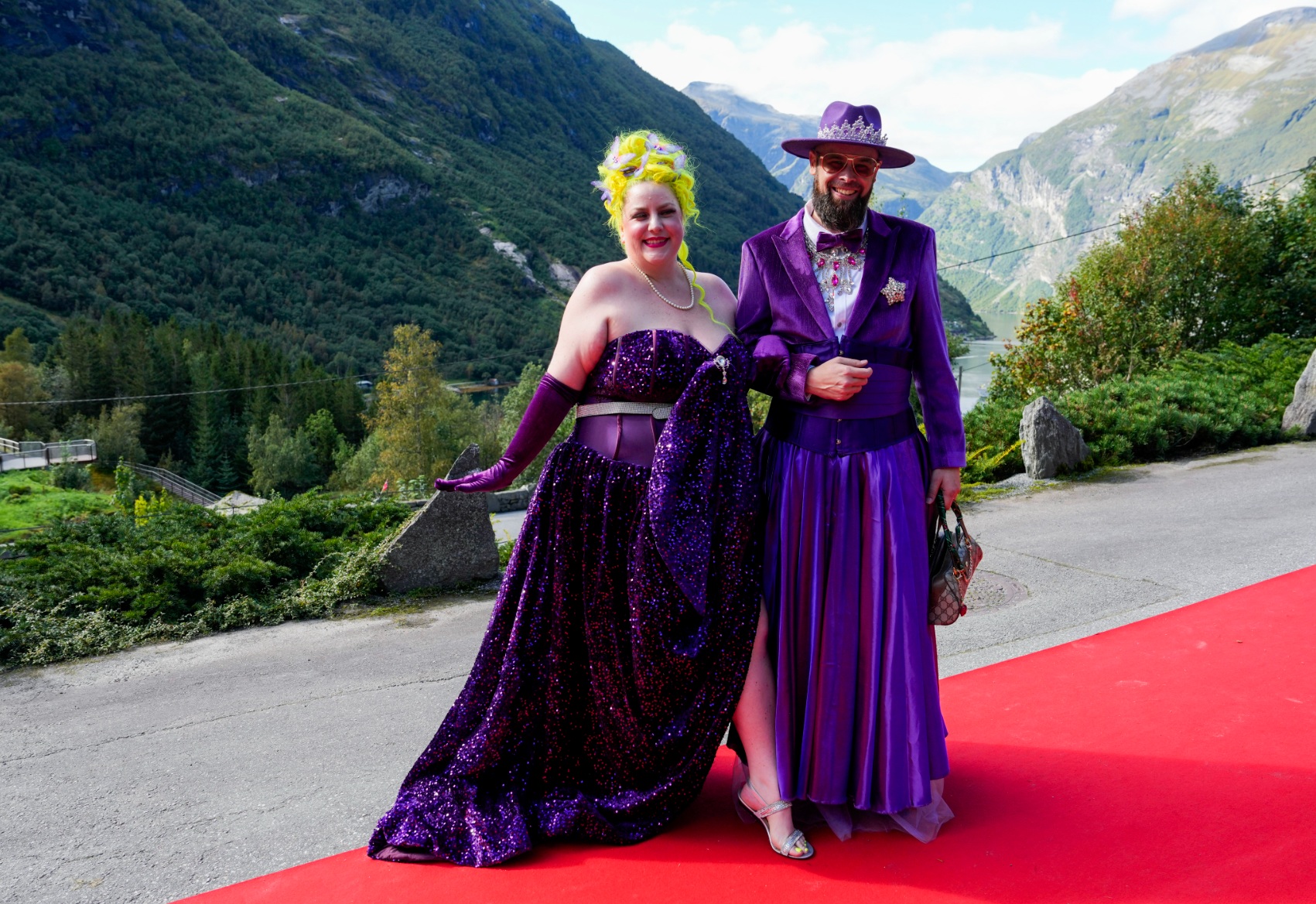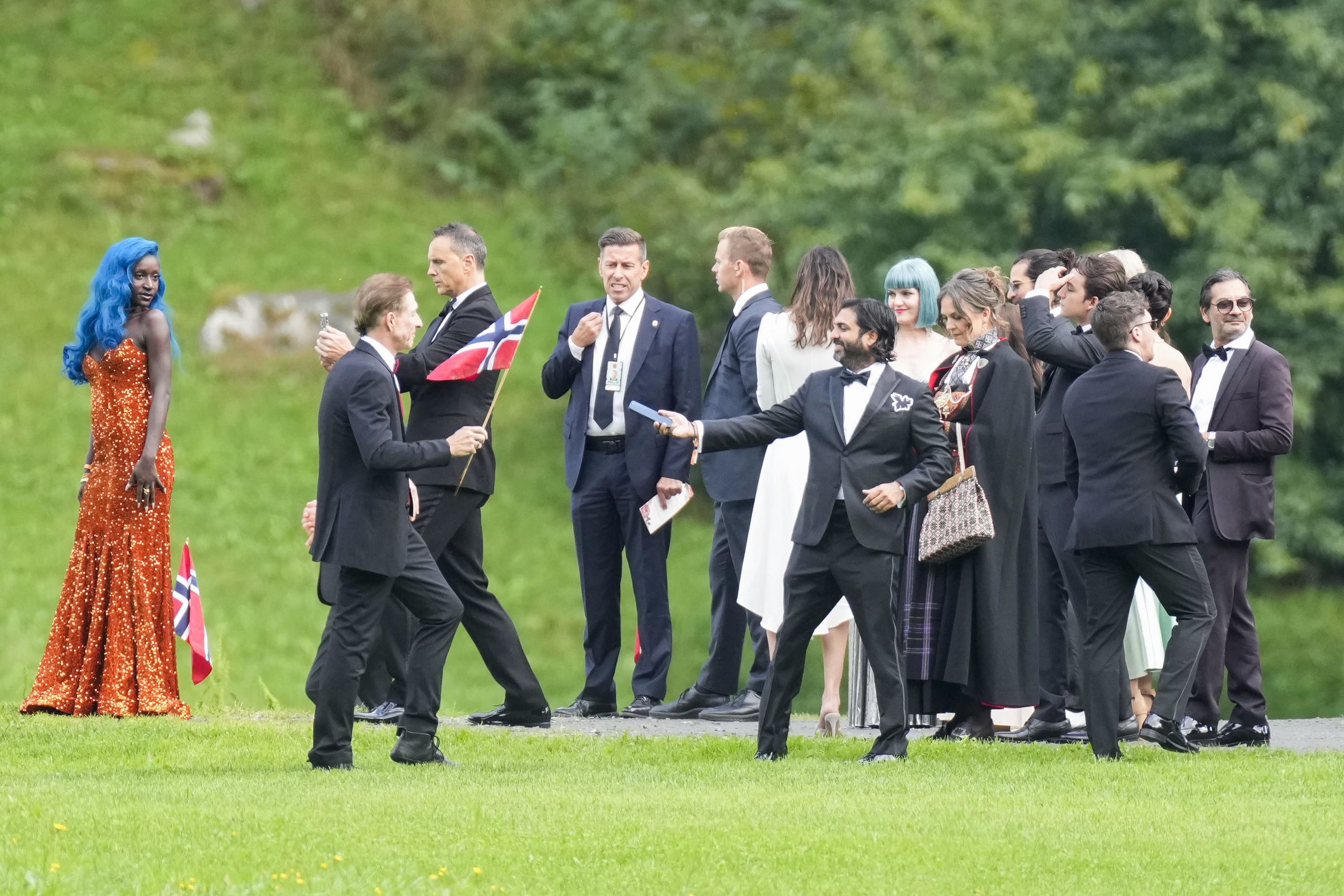 En cuanto al dress code se pidió se les pidió a los invitados evitar el blanco. Es una ocasión glamurosa y se animó a las mujeres a vestir de gala y a los hombres llevar esmoquin. Algunos como el músico Harald Austad y la modelo Margie Plu, en la imagen, se lo han tomado al pie de la letra.