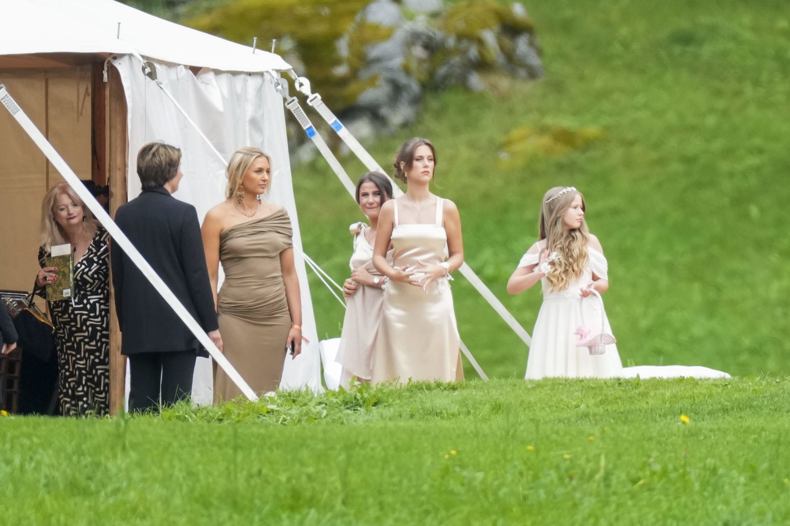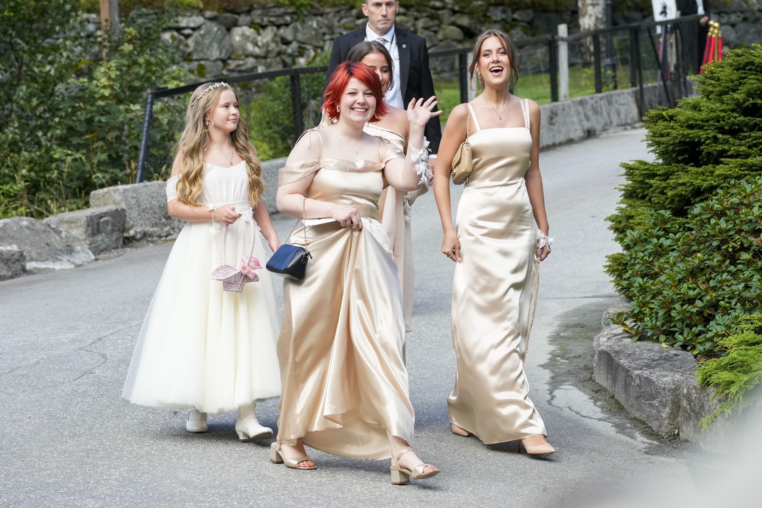 Leah y Emma Behn, hijas de Marta Luisa de Noruega, fruto de su matrimonio con el fallecido Ari Behn. A pesar de sus reticencias iniciales al noviazgo de su madre con el chamán, no han querido perderse un día tan importante para ella. Lo han hecho con dos elegantes diseños en color champán.