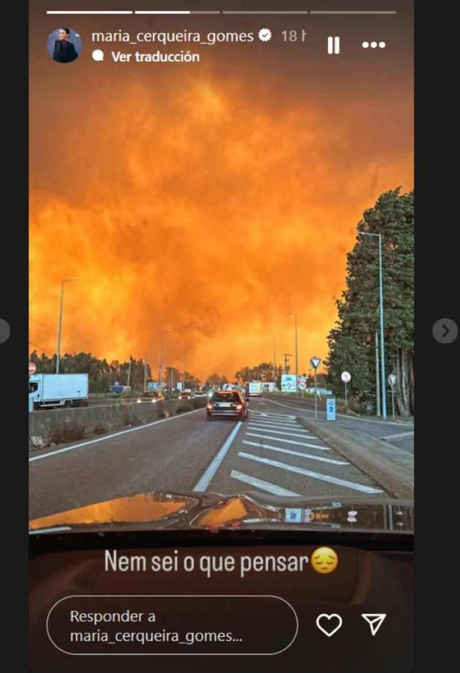 María, que se ha visto atrapada en medio del incendio cuando viajaba de Oporto a Lisboa ha compartido con sus seguidores imágenes y videos del momento: "Tengo el fuego detrás de mí, es un escenario de terror. Lo que vemos en las películas y en las noticias todos los años, creo que solo una persona que lo vive puede entender por lo que pasan estos hombres, y lo rápido que sucede todo. En un segundo sientes que tu vida está en peligro", ha explicado en sus 'stories' de Instagram y en las imágenes donde podemos ver la gravedad de la situación desde su vehículo.