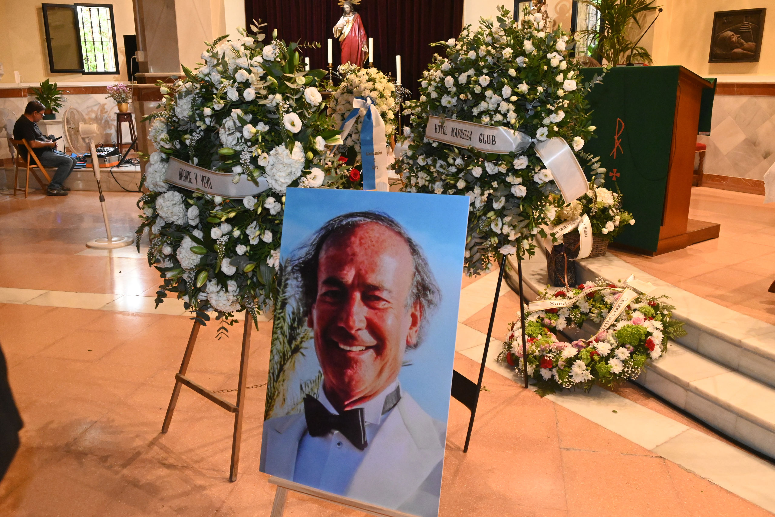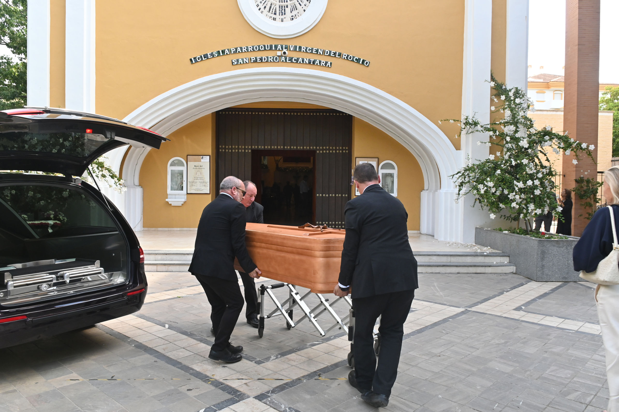 El cuerpo de Luis Ortiz a su llegada a la Iglesia Parroquial, Virgen del Rocío, en San Pedro Alcántara. Dentro del templo, familiares y amigos se reunían para recordarle.
