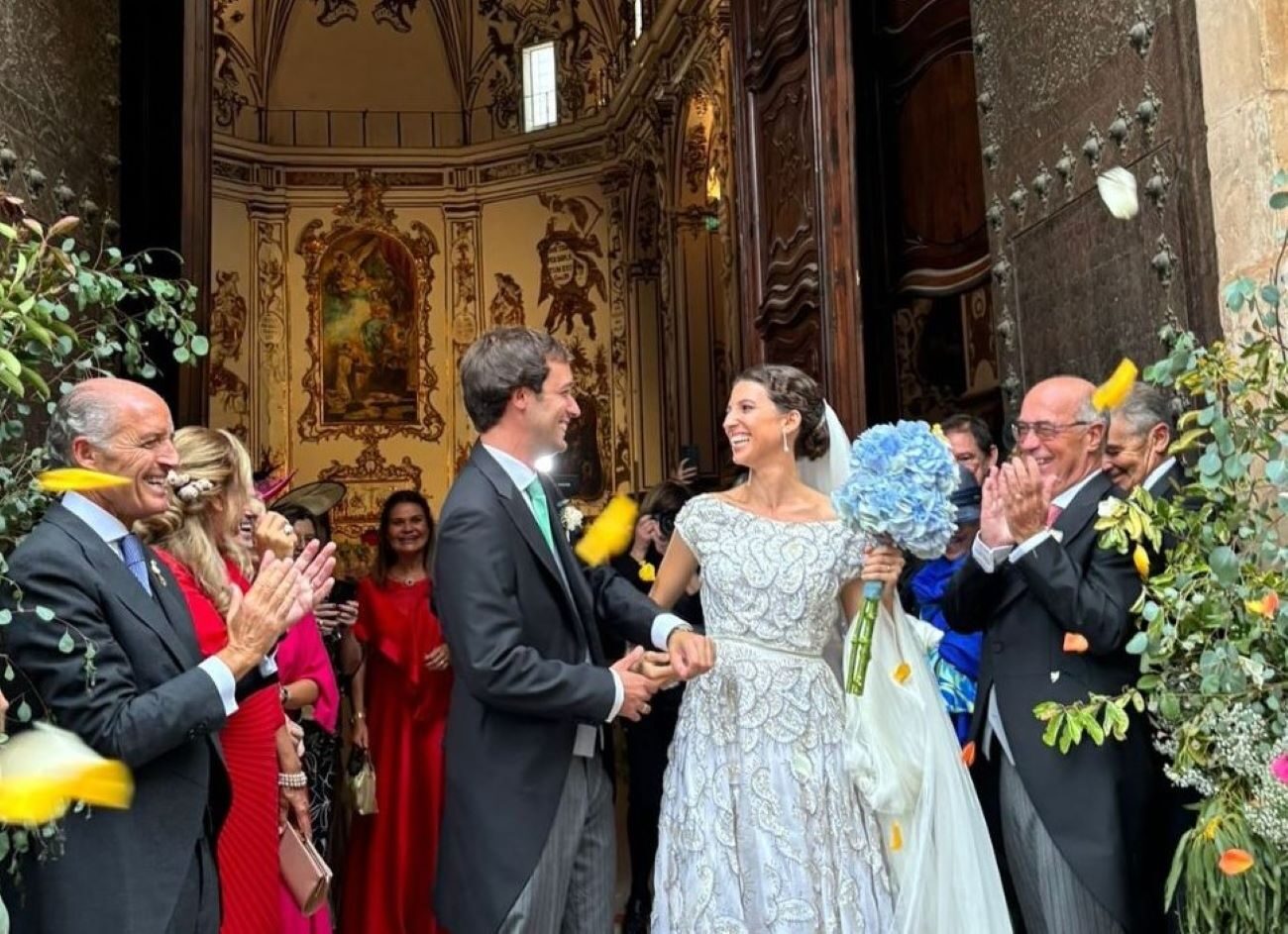 La novia llegó al templo del brazo de su padre y padrino, Francisco Camps con un vestido que perteneció a la familia adaptado por la diseñadora Lila Albanozzo, en quien confían habitualmente tanto Isa como su madre Isabel Bas. Un vestido bordado con pedrería en tono plata con escote barco y el velo rematado con una peina, y un original ramo de hortensias azules del Atelier de la Flor.